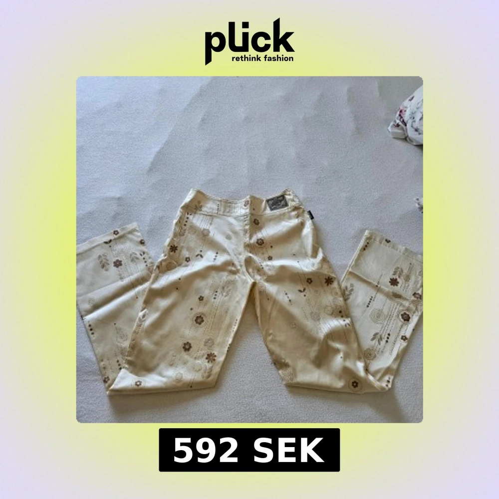 Snygga beige byxor från Amnesia original Paris med ett unikt blommönster i guld, vitt och brunt. Byxorna har en rak passform och är dekorerade med knappar i midjan. Perfekta för en stilren look. Tillverkad i acetat som är konstgjord silke - vekfri, andningsbar och lättskött material! Stl 42 fransk, som betyder att de passar till stl 38/40