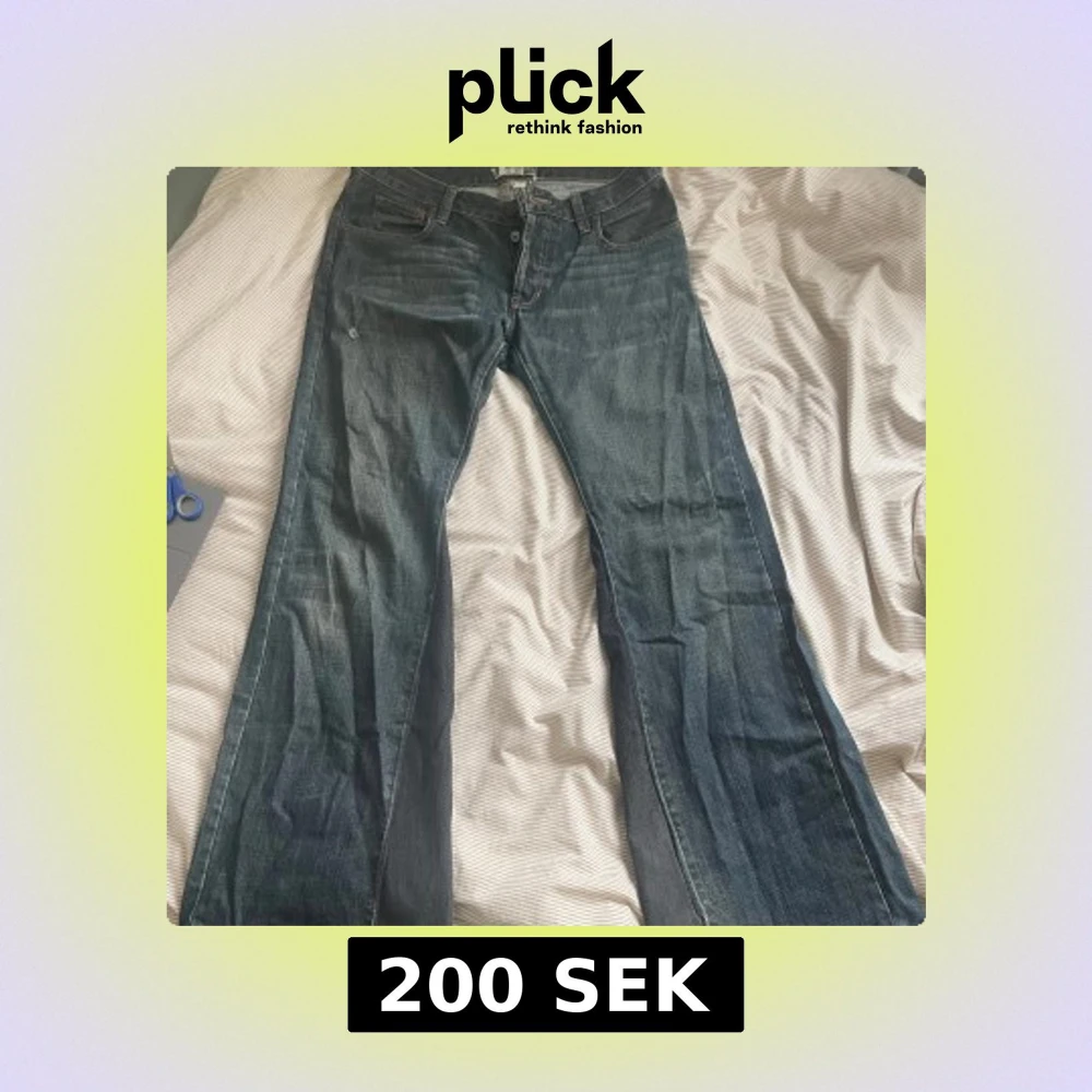 Säljer ett par blå jeans med riktigt breda utsvängda ben och bootcut-stil. Jeansen har klassisk femficksdesign, slitningar och rå kant nertill. Materialet är denim och färgen är en tvättad blå med ljusare partier. Jag har sytt ut jeansen själv men sömmarna är i fint skick!.