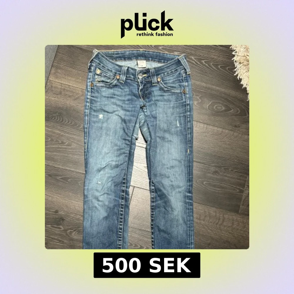 Vintage True religion jeans med snygga slitningar. Köpta på Plick, förra ägaren har sytt förstärkning i grenen och sytt de tajtare i låren. De är raka men har uppklippningar vid bensluten. Storlek 26 39 midja (78), 16 från gren till midja, innerben 76 Benöppning 18 (uppklippt). Dragkedja o knapp.