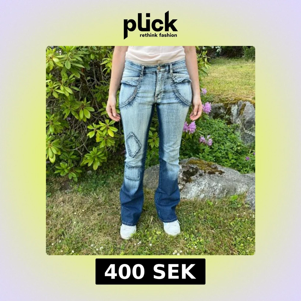 Säljer ett par riktigt coola bootcut jeans i ljusblå och mörkblå denim med slitningar, patchdetalj på benet och markerade fickor fram och bak. 🩷 Midja: 37 cm 🩷 Ytterben: 103 cm 🩷 Innerben: 80cm 🩷