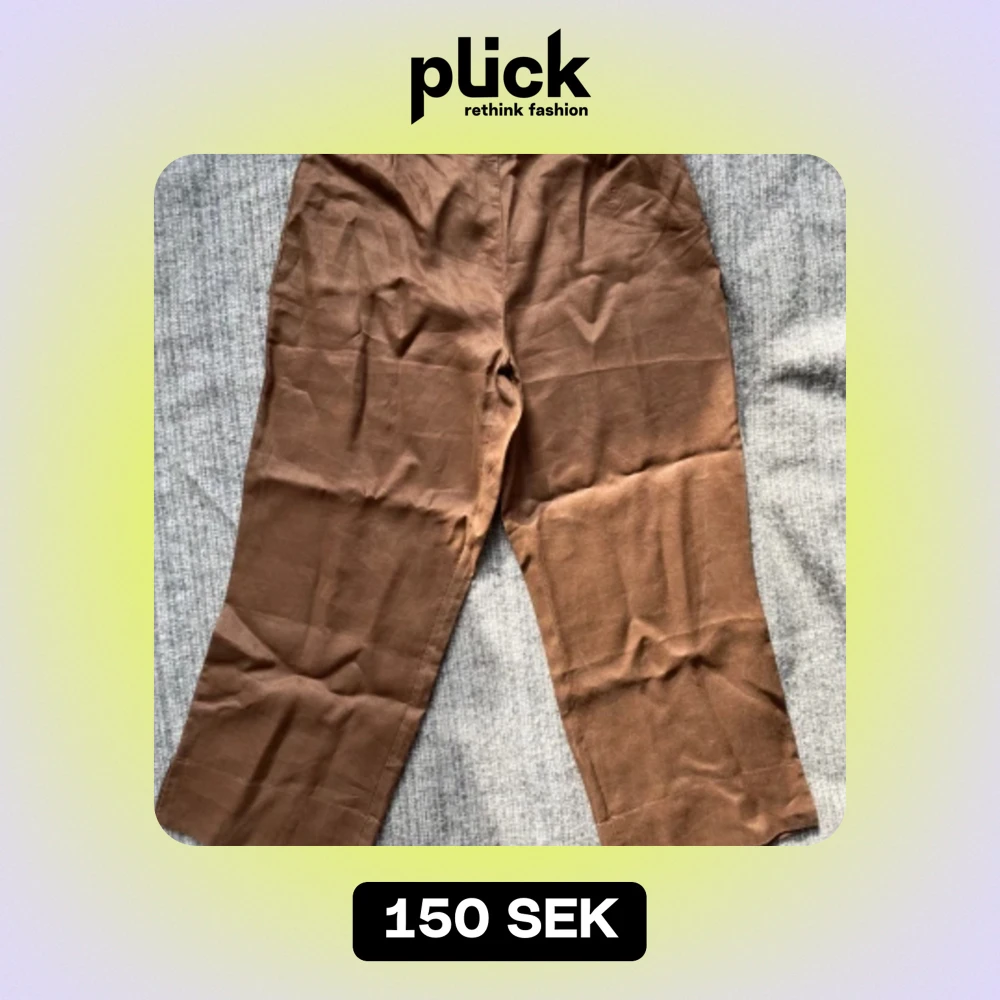 100% lin från Vila, storlek M. Tunna och luftiga, inte hellånga. Ca 37 cm i midjan mätt rakt över, 80 cm långa mätt på utsidan, 58 cm mätt på insidan från grenen ner. Har flera foton. Dragkedja på sidan, obs! Den man drar i har ramlat av.