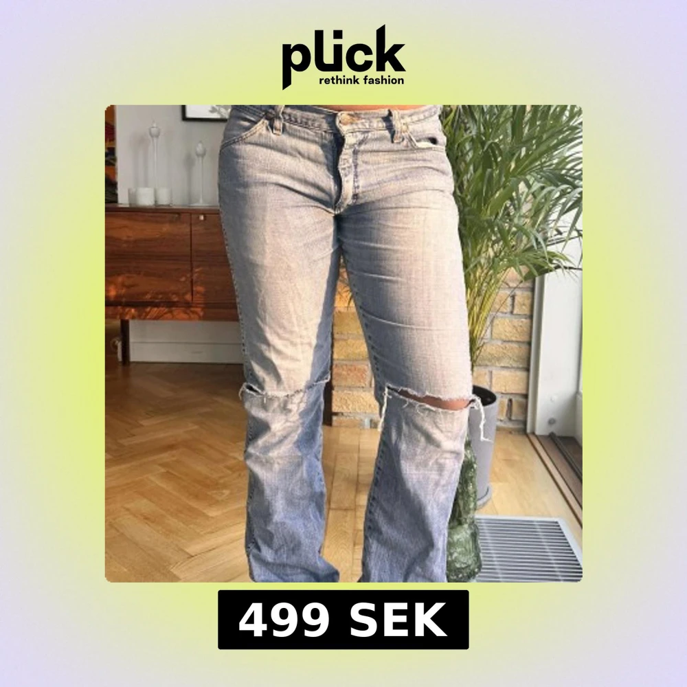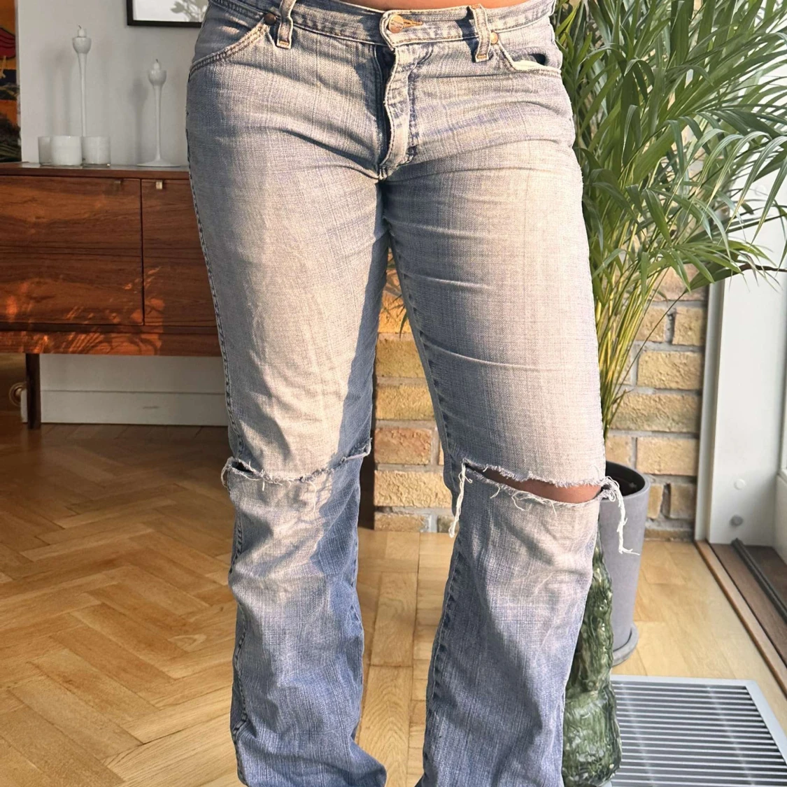 Säljer ett par blå jeans med slitningar på knäna. De har en klassisk femficksdesign och knappgylf. Perfekta för en avslappnad stil. Skriv för frågor💕STORLEK S/M