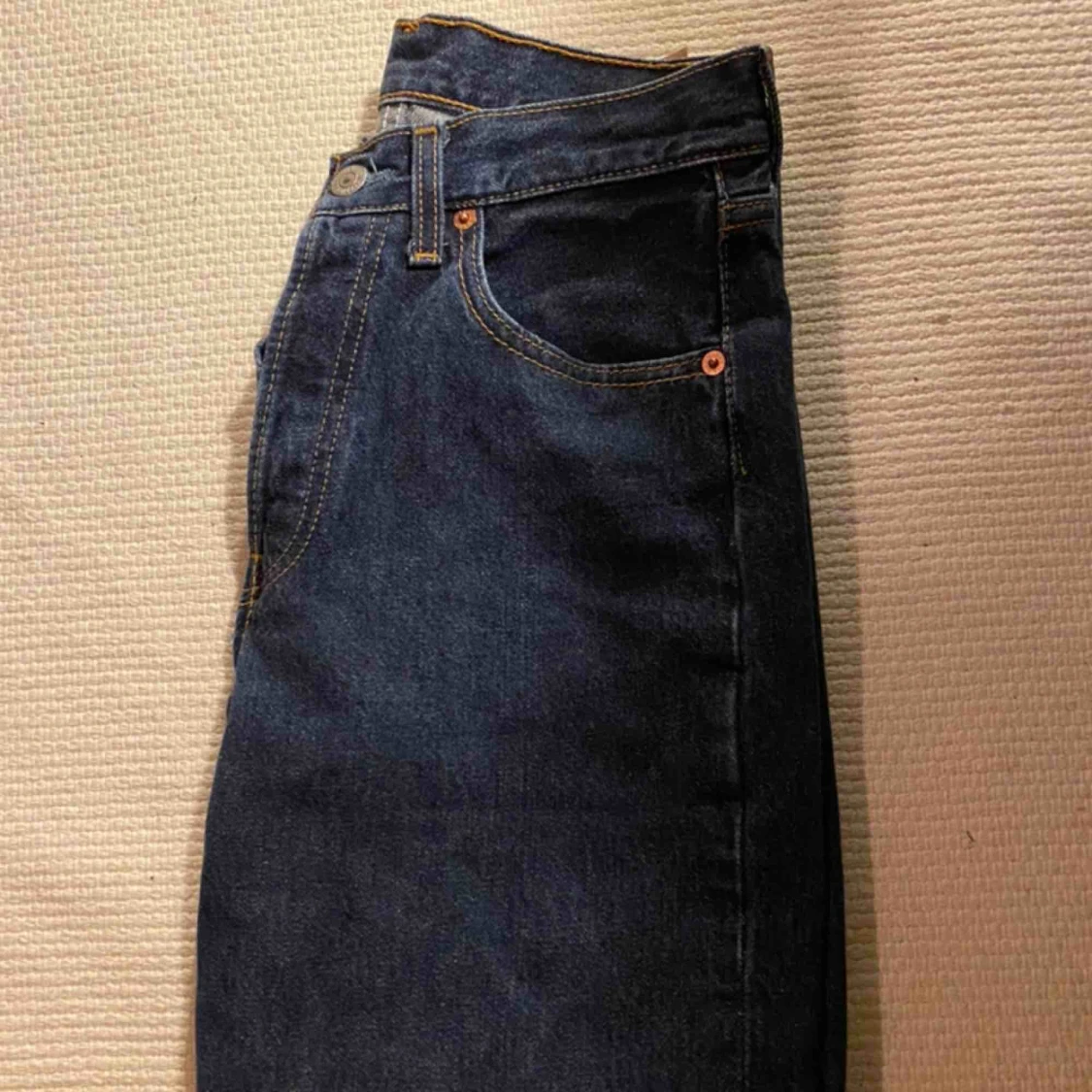 Vintage Levi’s jeans i mörkare blå jeansfärg. Jag köpte dessa och gick utefter måttet som står på lappen, dom passade inte alls mig så skulle säga att dom är ungefär mellan W24-25 och L 30 då dom är uppklippta. Köparen står även för frakten.