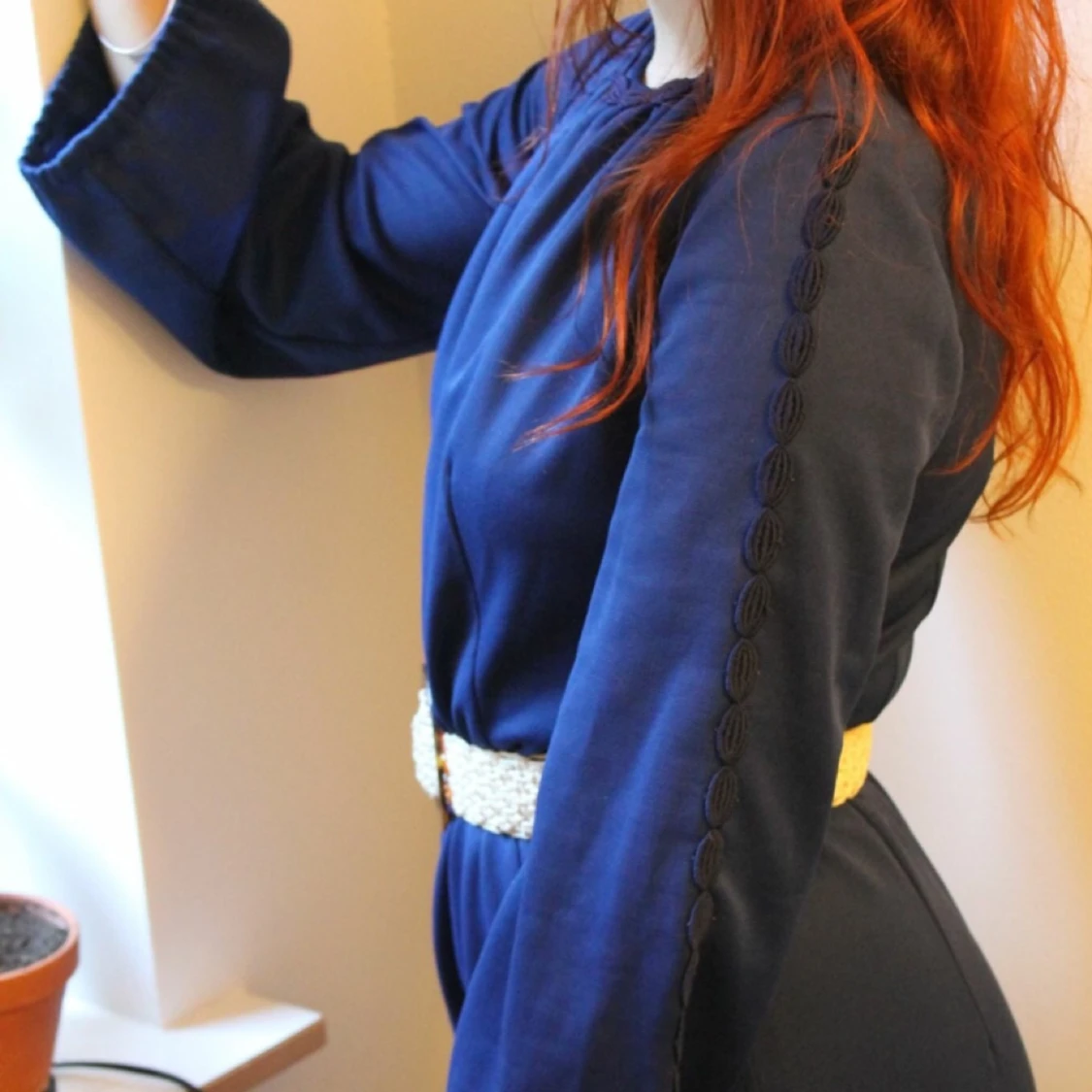 Vintage byxdress med fina detaljer längst armarna och halsen. Ingen storleksmärkning, men jag på bilden är storlek 36-38. Tror dock den kan passa en 40a beroende på hur en vill att den ska sitta. Köparen betalar frakt eller mötas upp i Gbg!