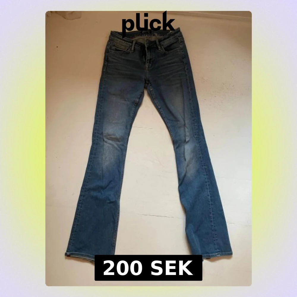 Snygga blå jeans från Crocker i strl 28/35 🩵 De är bootcut och skulle säga att de är mid waist. Jag är ca 160 cm lång och de var tyvärr lite för långa på mig därav slitningar!