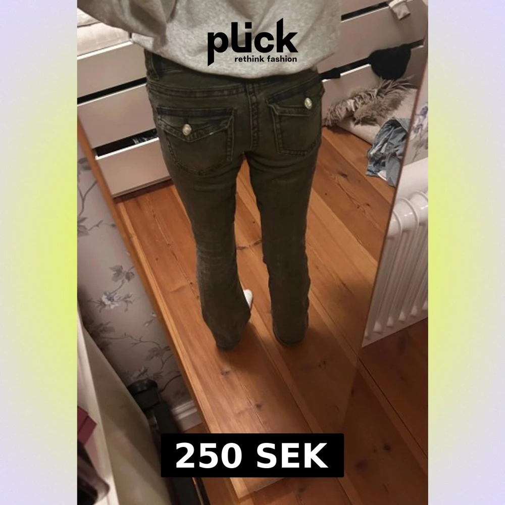 Säljer ett par snygga utsvängda och lågmidjade jeans. De har coola knappar på bakfickorna. Strl 34. Säljer pga att de inte kommer till användning längre. Skriv om du har frågor!☺️