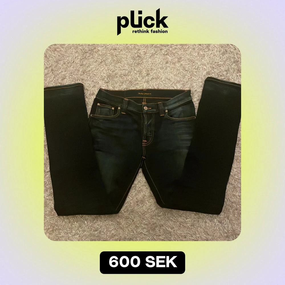 Snygga mörkblåa jeans från Nudie Jeans med orange sömmar. Jeansen har en normal passform och är tillverkade i denim. Skick 9/10, jag har använt dom 2-3 gånger. Priset är förhandlingsbart, fråga om det är något du undrar!!