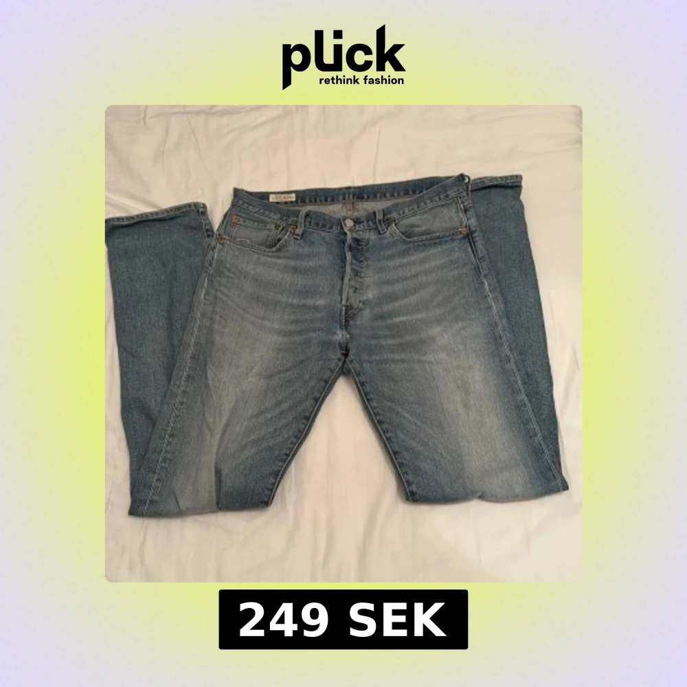 Säljer ett par klassiska Levi's 501 jeans i ljusblå tvätt med raka ben och fem fickor. Jeansen har knappgylf och den ikoniska bruna läderpatchen bak. Perfekt passform och snygg faded look som ger en chill vibe.