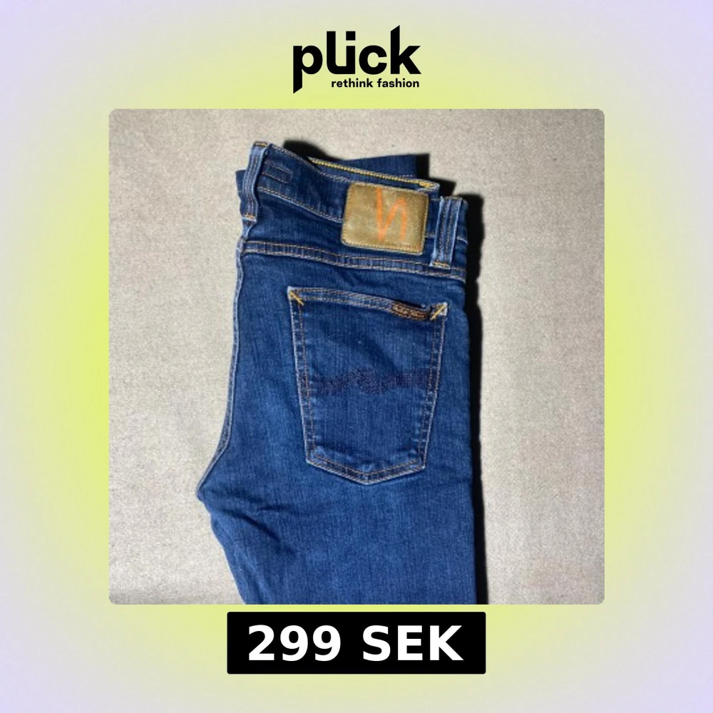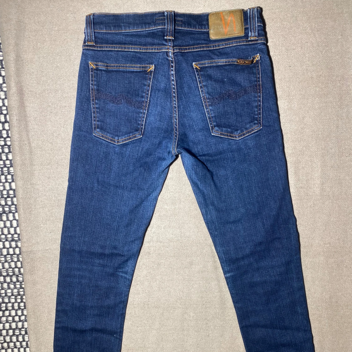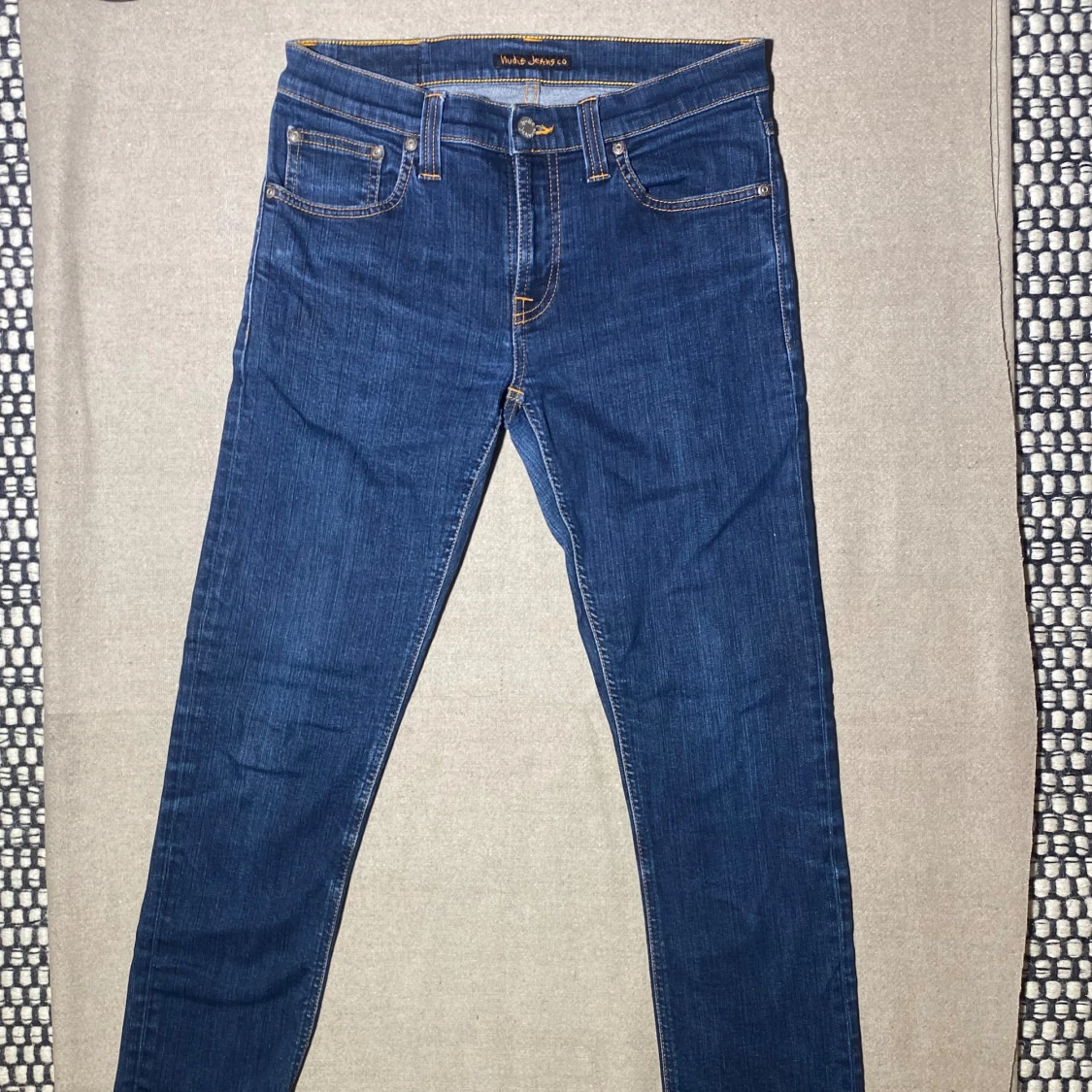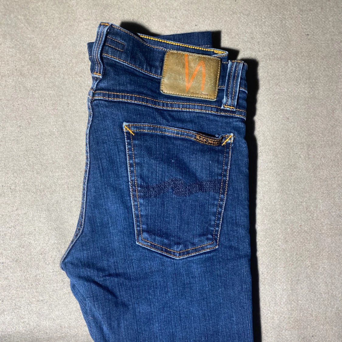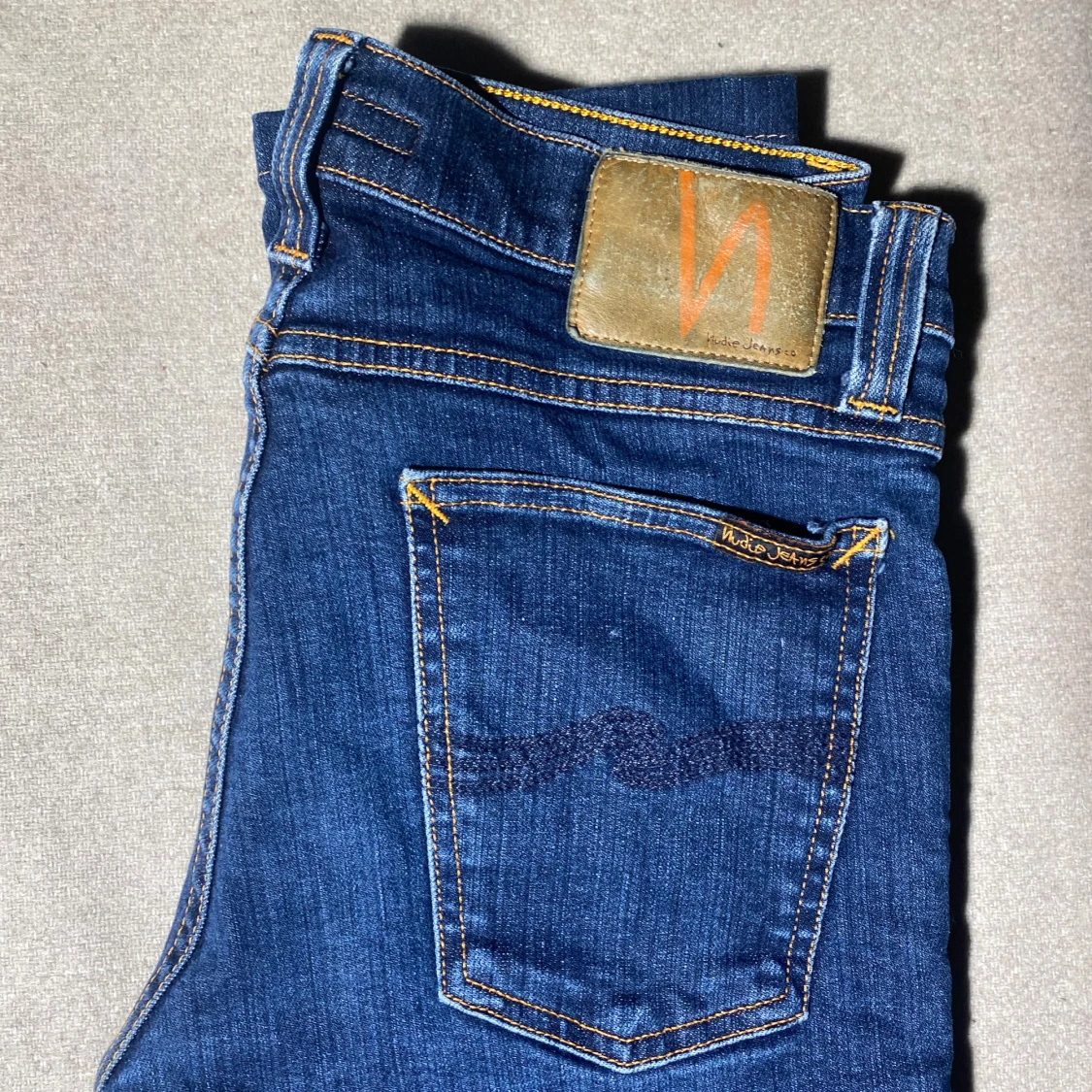 Säljer ett par klassiska blå jeans från Nudie Jeans med snygga kontrastsömmar och ikonisk våg på bakfickorna. Jeansen har normal midja, fem fickor och är tillverkade i mjukt denimtyg med stretch för extra komfort. Dm vid frågor pris kan diskuteras ‼️♟️W28 L34 men snarare 32