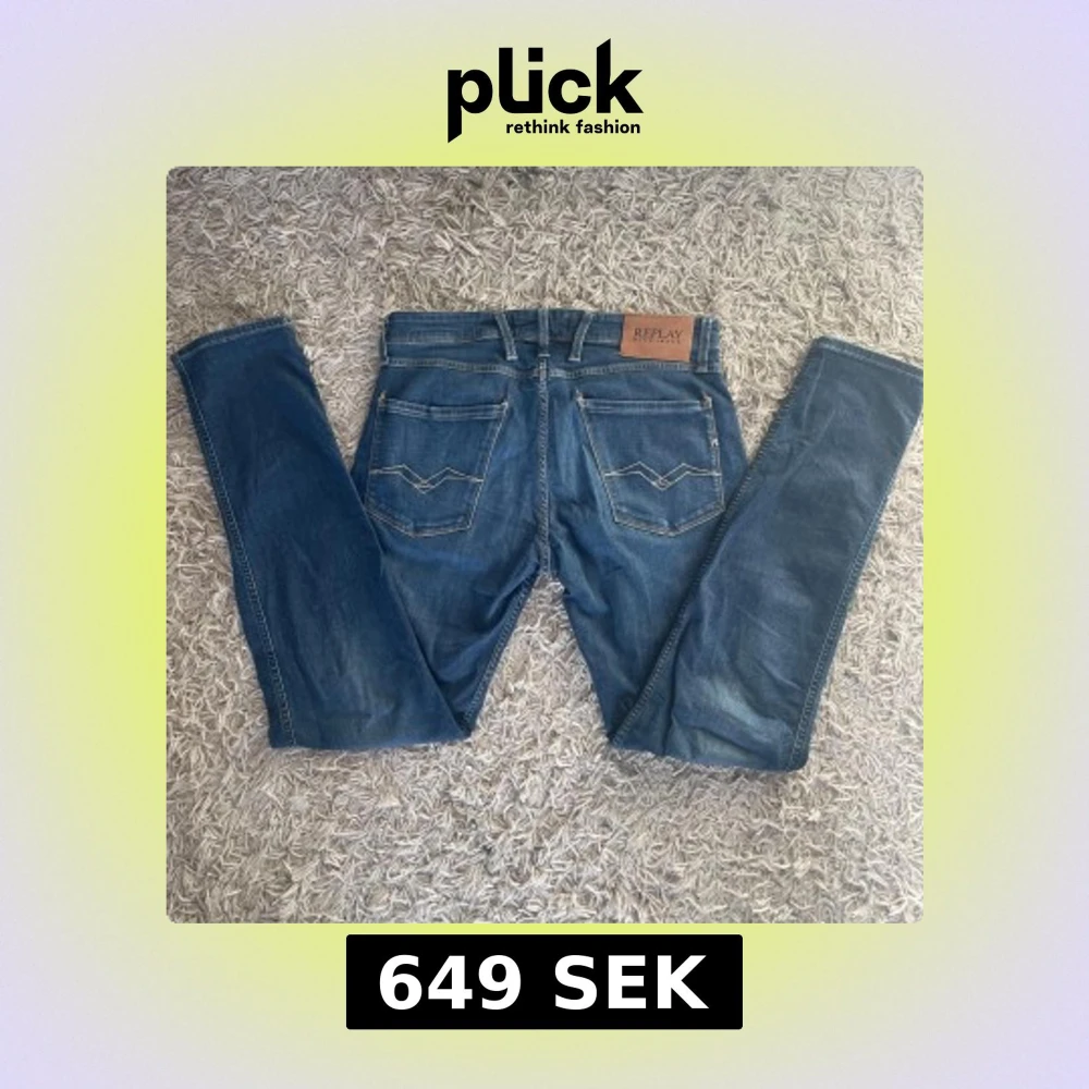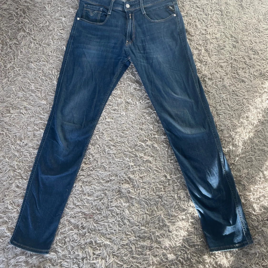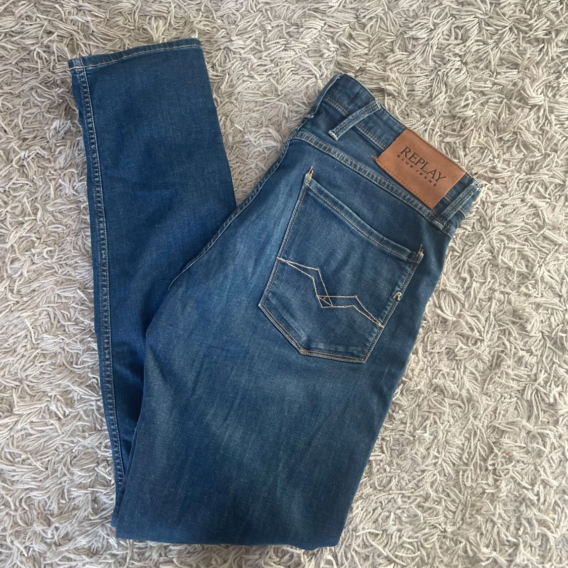Snygga blå jeans från Replay med klassisk femficksdesign och snygga sömmar på bakfickorna. De har en knappgylf och är perfekta för en avslappnad stil. Märkeslappen i läder på baksidan ger en extra touch.