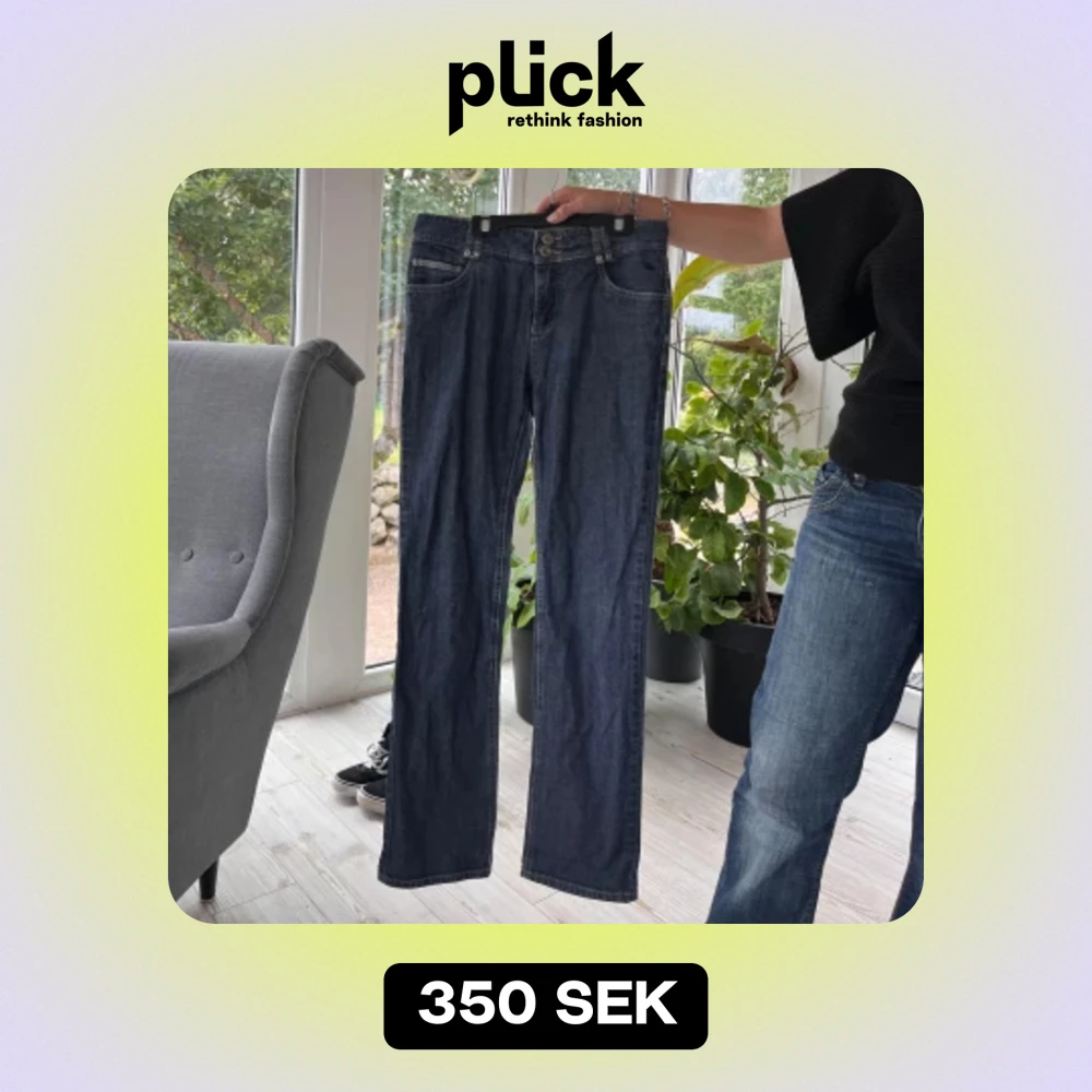 Säljer ett par klassiska mörkblå jeans i straight fit från Hillevi . De har snygga och detaljerade fickor och knappar bak. Säljer pga av att de är för små!💞