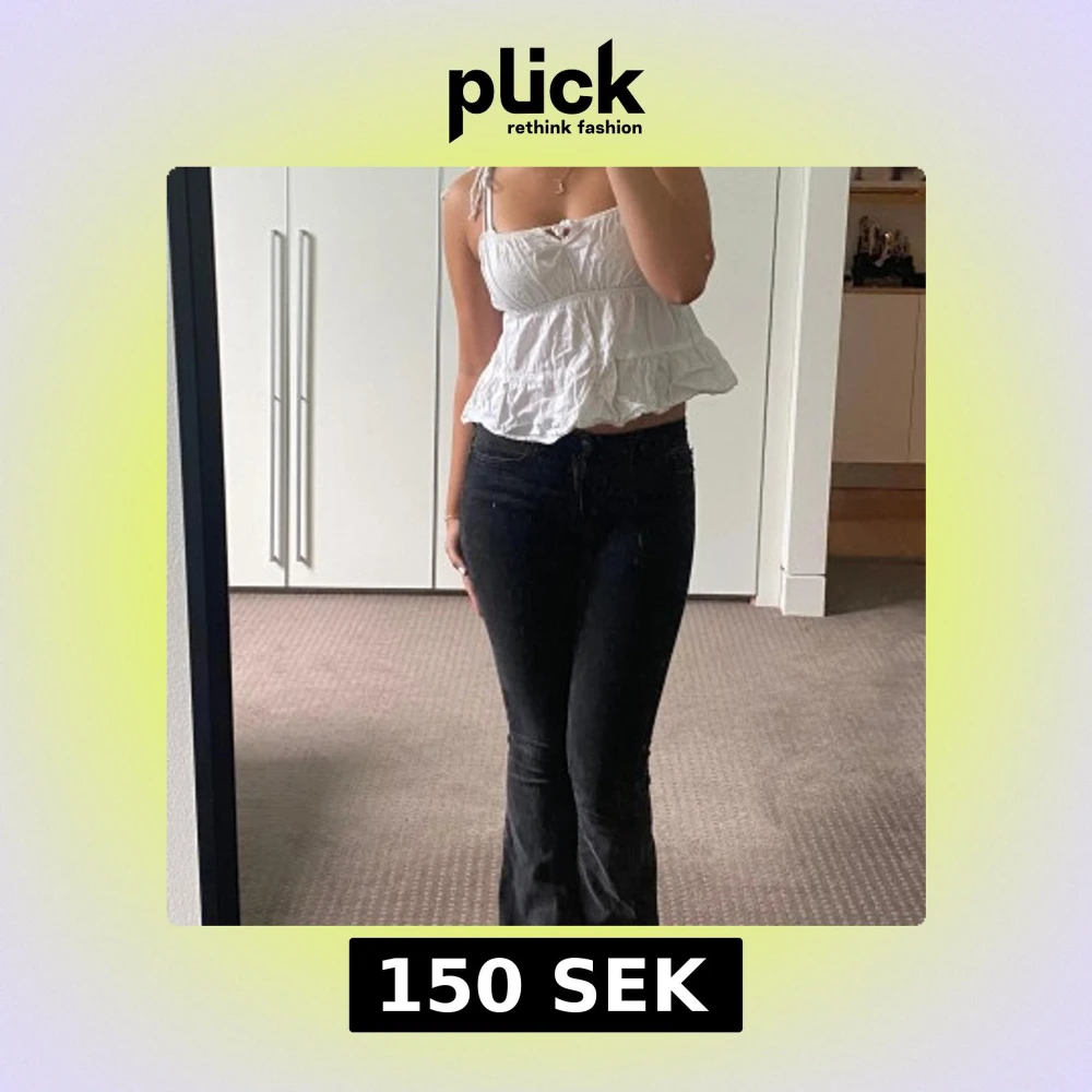 Säljer en söt vit ärmlös topp med volangdetaljer och knytband på axlarna. Säljer även de svarta bootcut jeansen från zara för 100. Köp båda tillsammans för 150💕