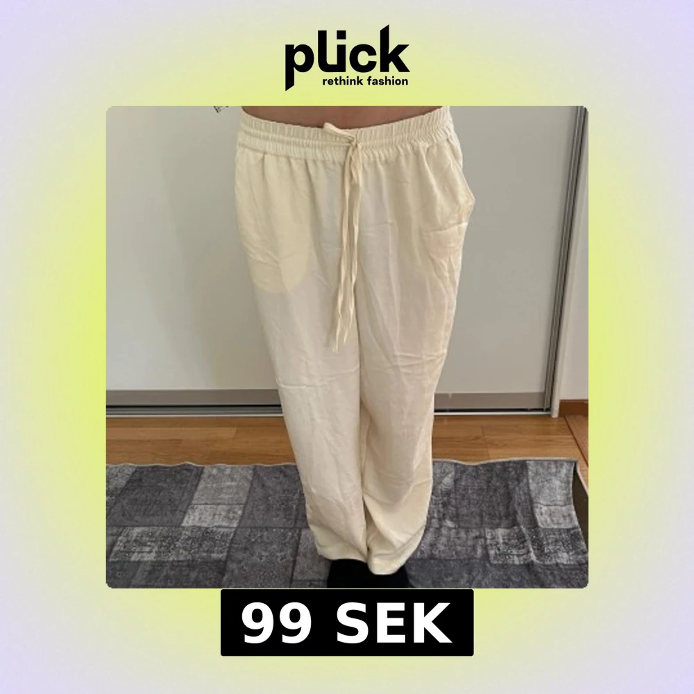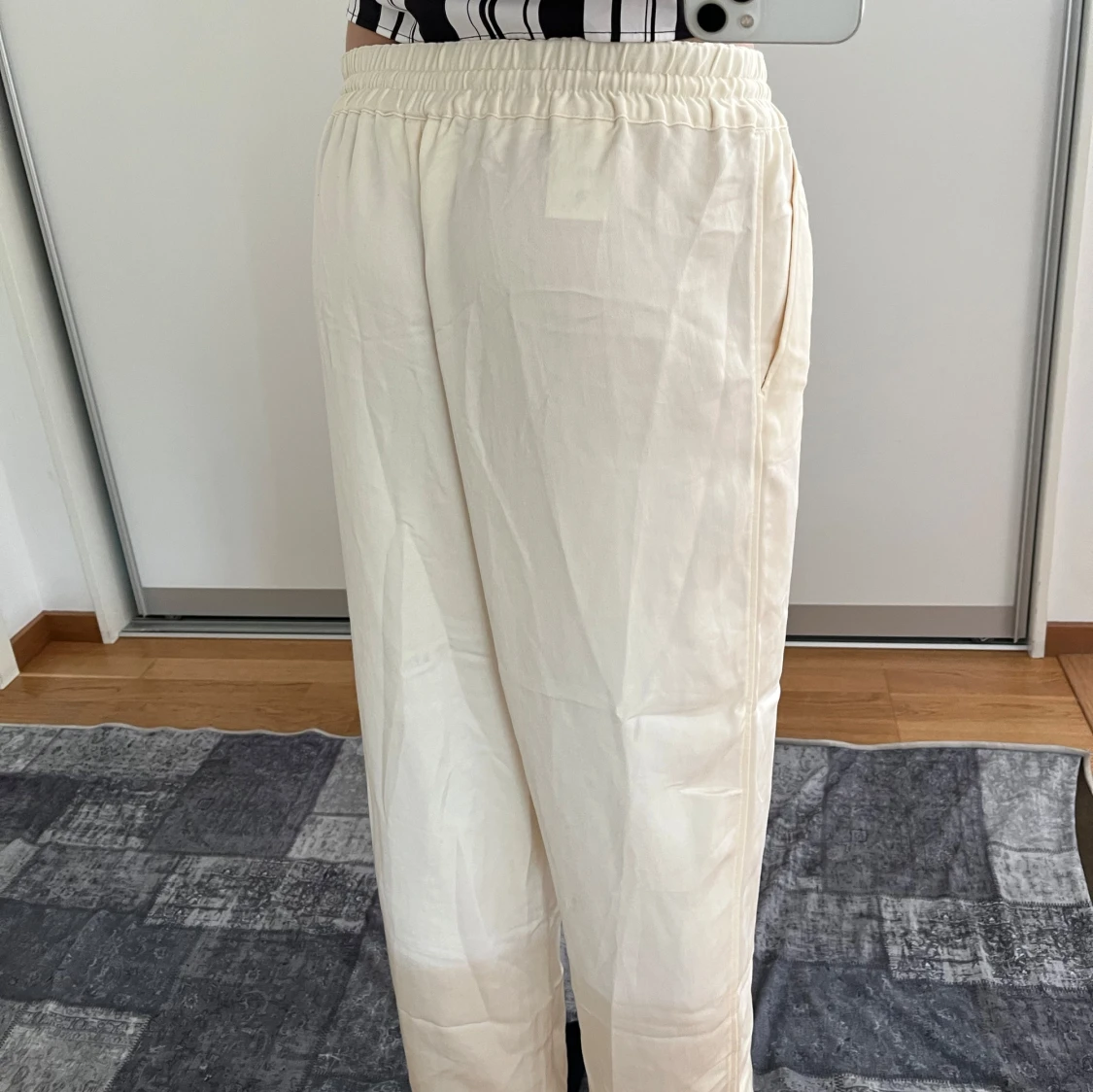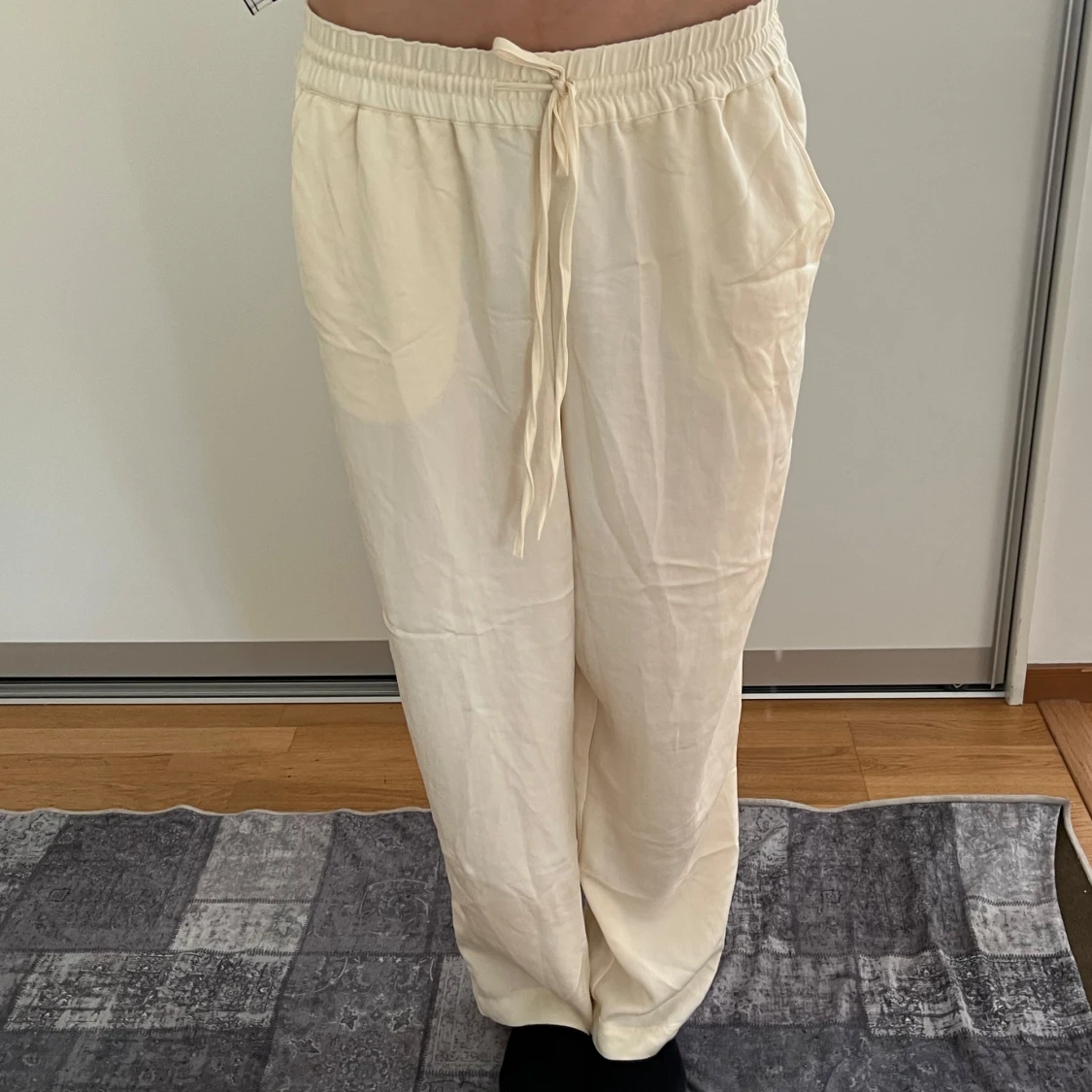 Säljer ett par vita/beiga linnebyxor. Byxorna har raka ben och sidfickor, perfekta för en chill och avslappnad look. Lätta och luftiga, passar grymt till sommaren. Materialet är lite glansigare och mjukare än vanliga linnebyxor, så de sitter och faller lite som silkesbyxor.