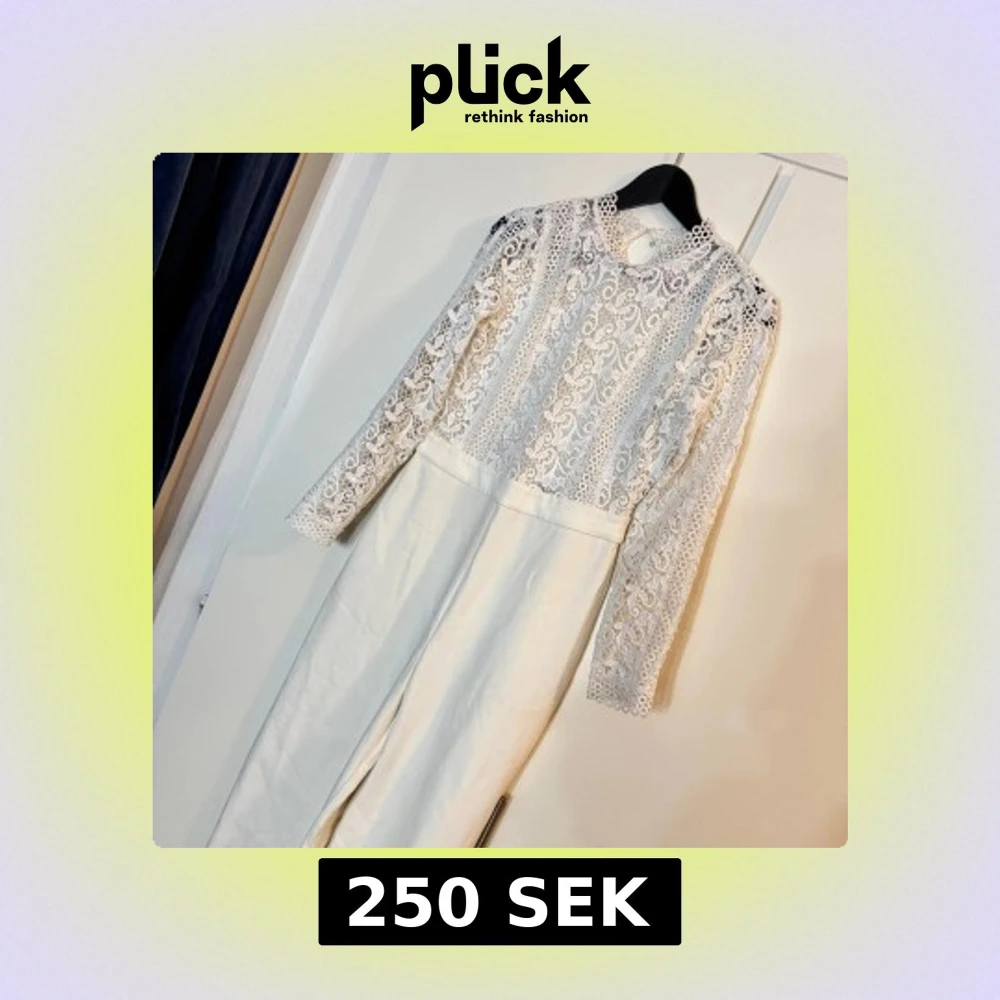 Säljer en elegant vit byxdress med långärmad överdel i spets och hög midja. Byxorna är vida och raka, vilket ger en stilren look. Perfekt för dig som vill sticka ut med en unik och trendig outfit.