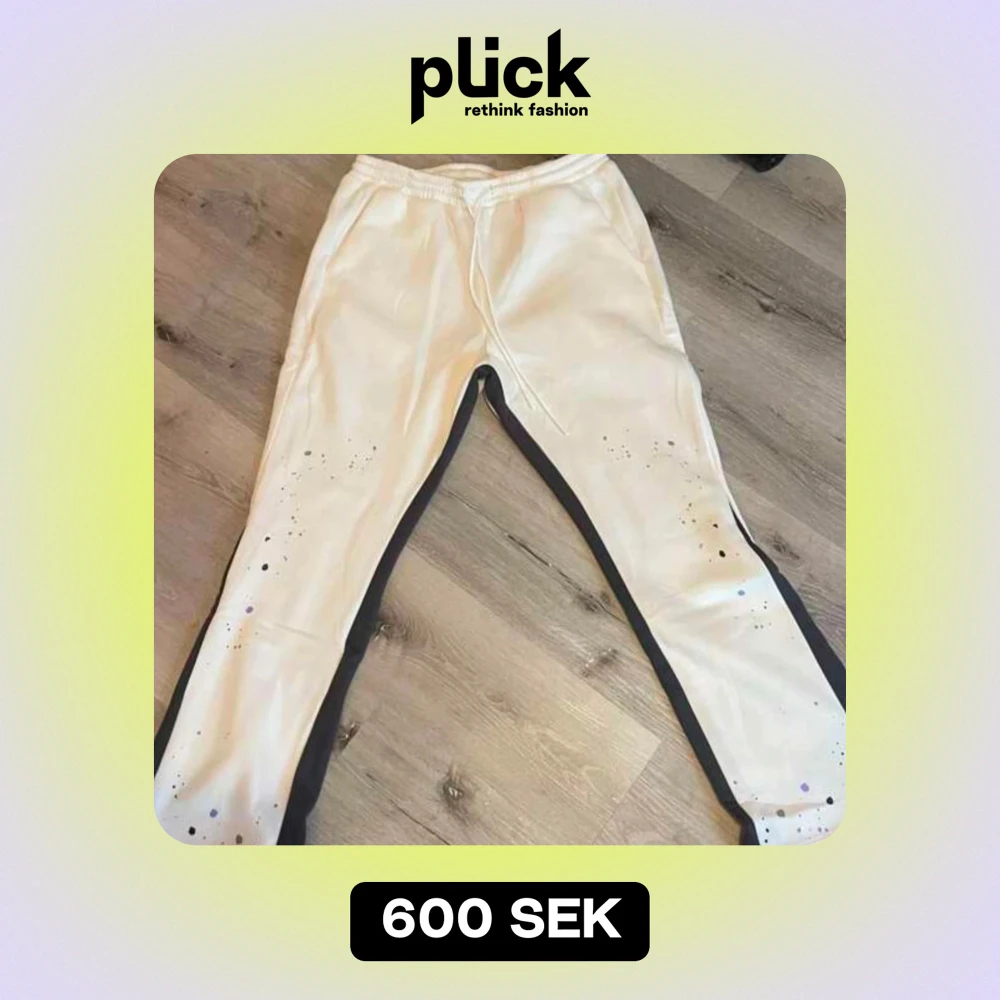 Säljer ett par vita mjukisbyxor med svarta sidopaneler och coola färgstänk. De har en bekväm passform och i storlek M men de passar även för storlek S. Byxorna är i mycket bra skick och är bara använda ett par gånger. Priset kan diskuteras.