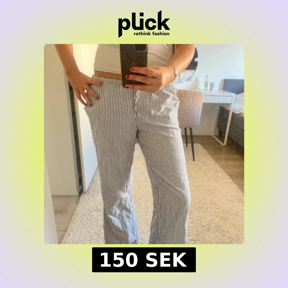 Snygga och luftiga linnebyxor med smala blå och vita ränder. Byxorna har rak passform, elastisk midja med snörning och sidfickor. För korta för mig som är 175
