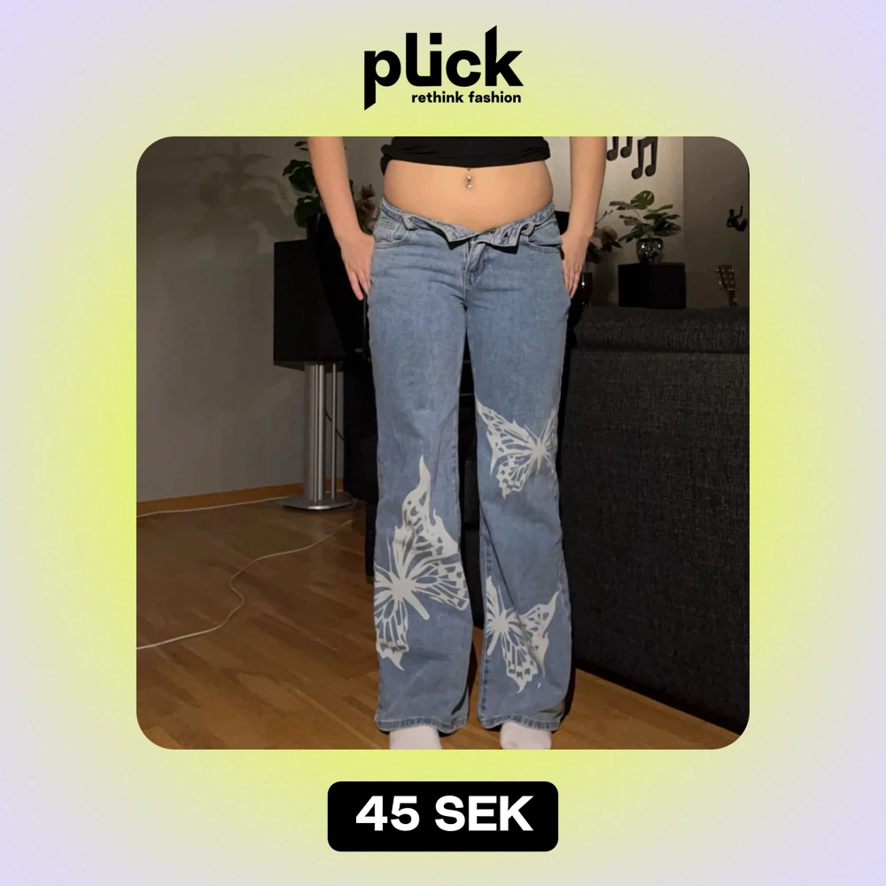 Snygga lågmidjade jeans med fjärilar på. Fick dom av en vän eftersom hon inte kunde ha dom men jag har aldrig använt dom heller, de har bara legat i garderoben. Nu har de dessutom blivit lite för små för mig. Skriv vid frågor, tryck gärna på köp nu 🥰