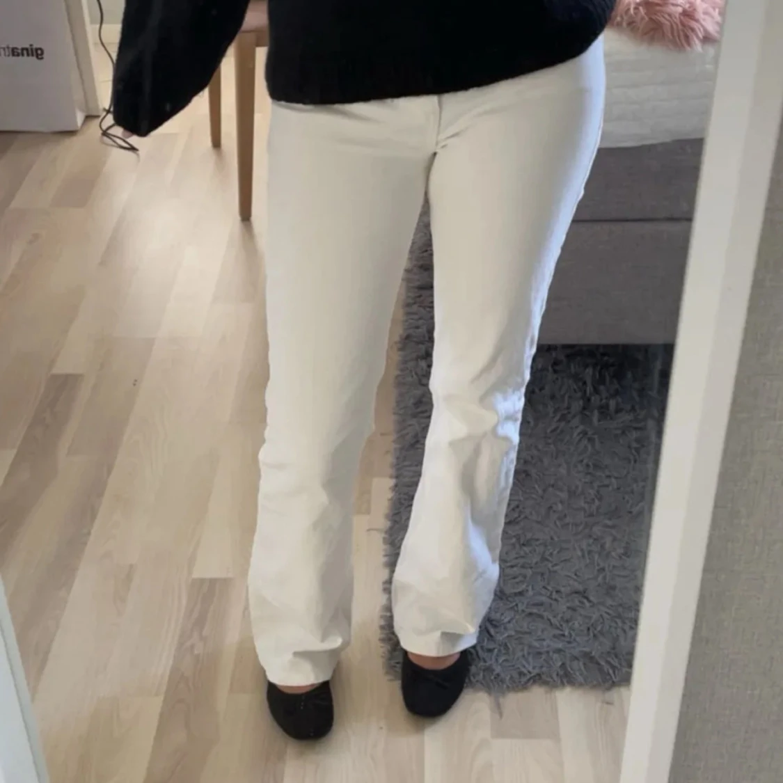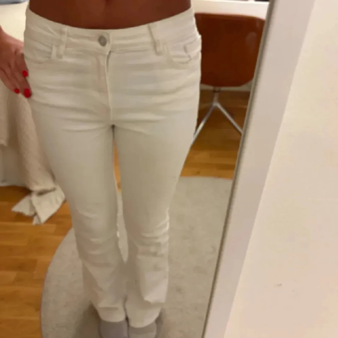 Vita bootcut jeans från Mango i storlek 38. Byxorna är använd ca 1-2 gånger (nästan hela nya) o har inga fläckar eller slitningar. Är osäker på pris så lämna gärna pris förslag om ni är intresserade. Skriv privat för flera bilder eller om ni har några frågor o funderingar över byxorna