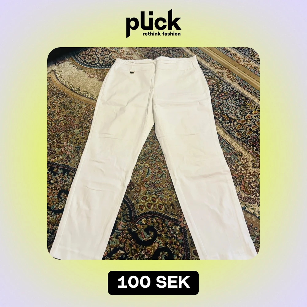 Säljer ett par stilrena vita byxor från Alfani i storlek 14S. De är gjorda av en mjuk och stretchig blandning av rayon, nylon och spandex, vilket gör dem bekväma att bära. Perfekta för både vardag och festliga tillfällen. Byxorna har en klassisk design med raka ben.