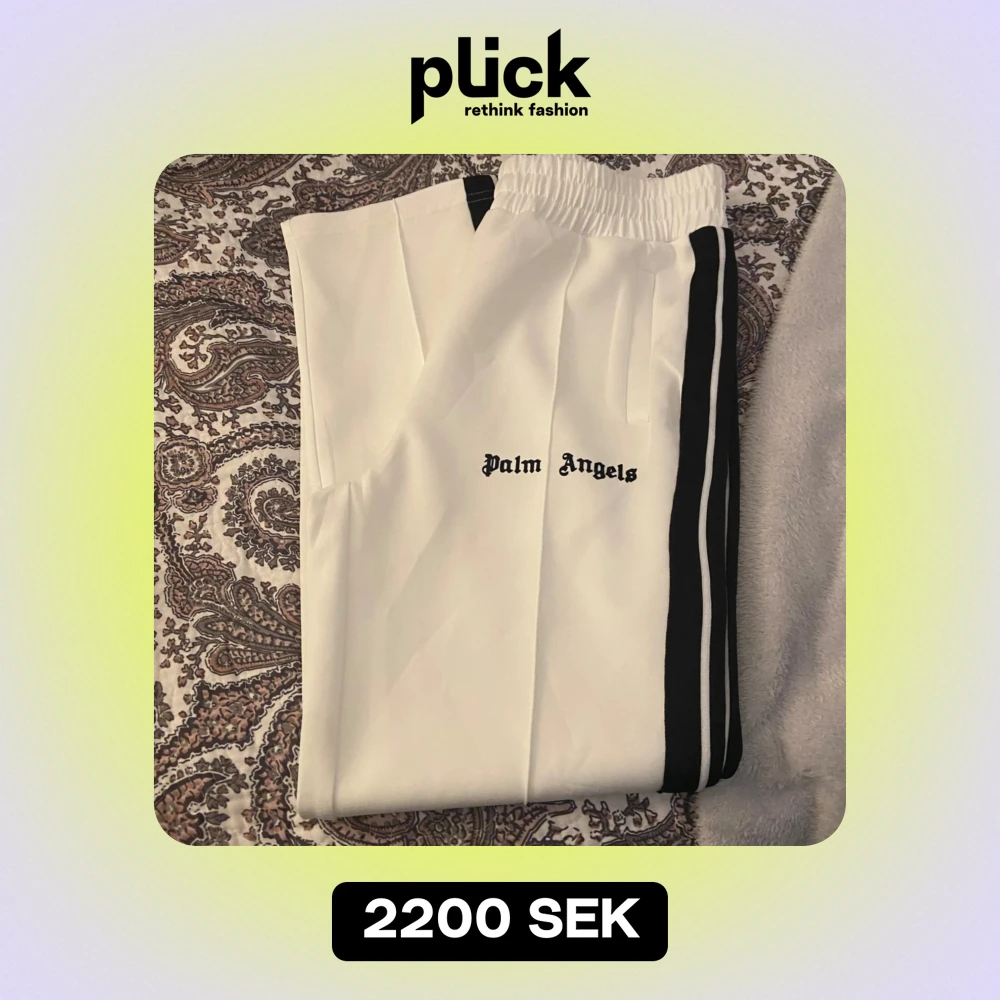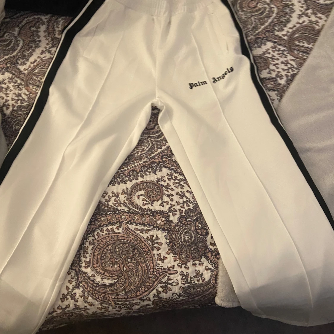 Säljer ett par vita byxor från Palm Angels i mycket bra skick. De har en elastisk midja och svarta ränder längs sidorna. Perfekta för en avslappnad och stilren look. Passar både till vardags och festliga tillfällen.