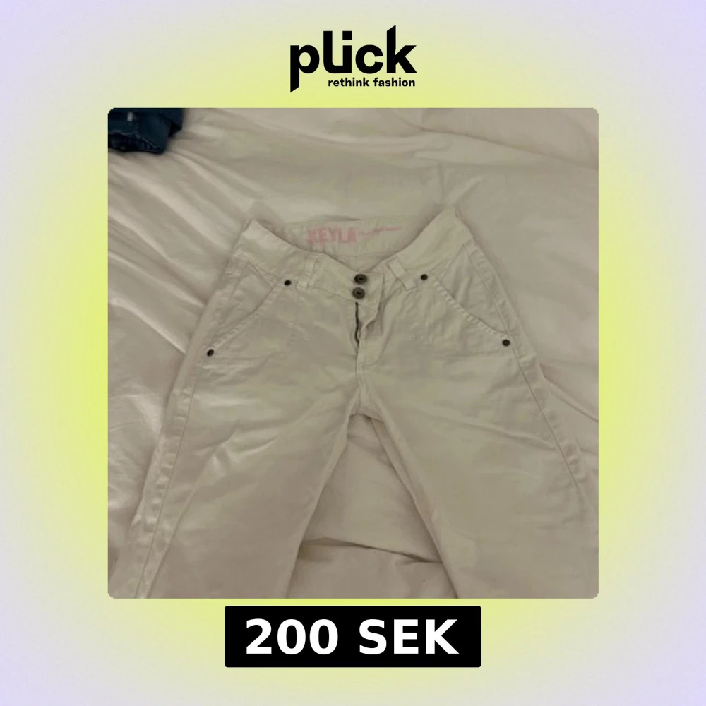 Snygga vita jeans från Peak Performance med raka ben och coola detaljer som dubbla knappar framtill och fickor med lock och knapp bak. Byxorna har en klassisk passform och är vintage