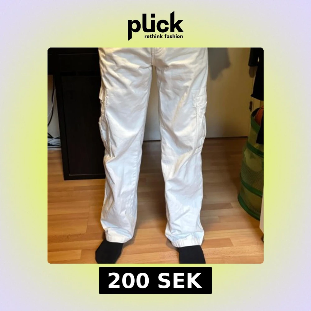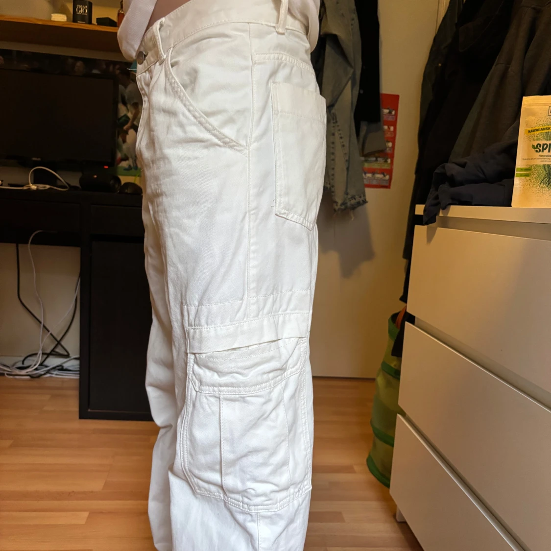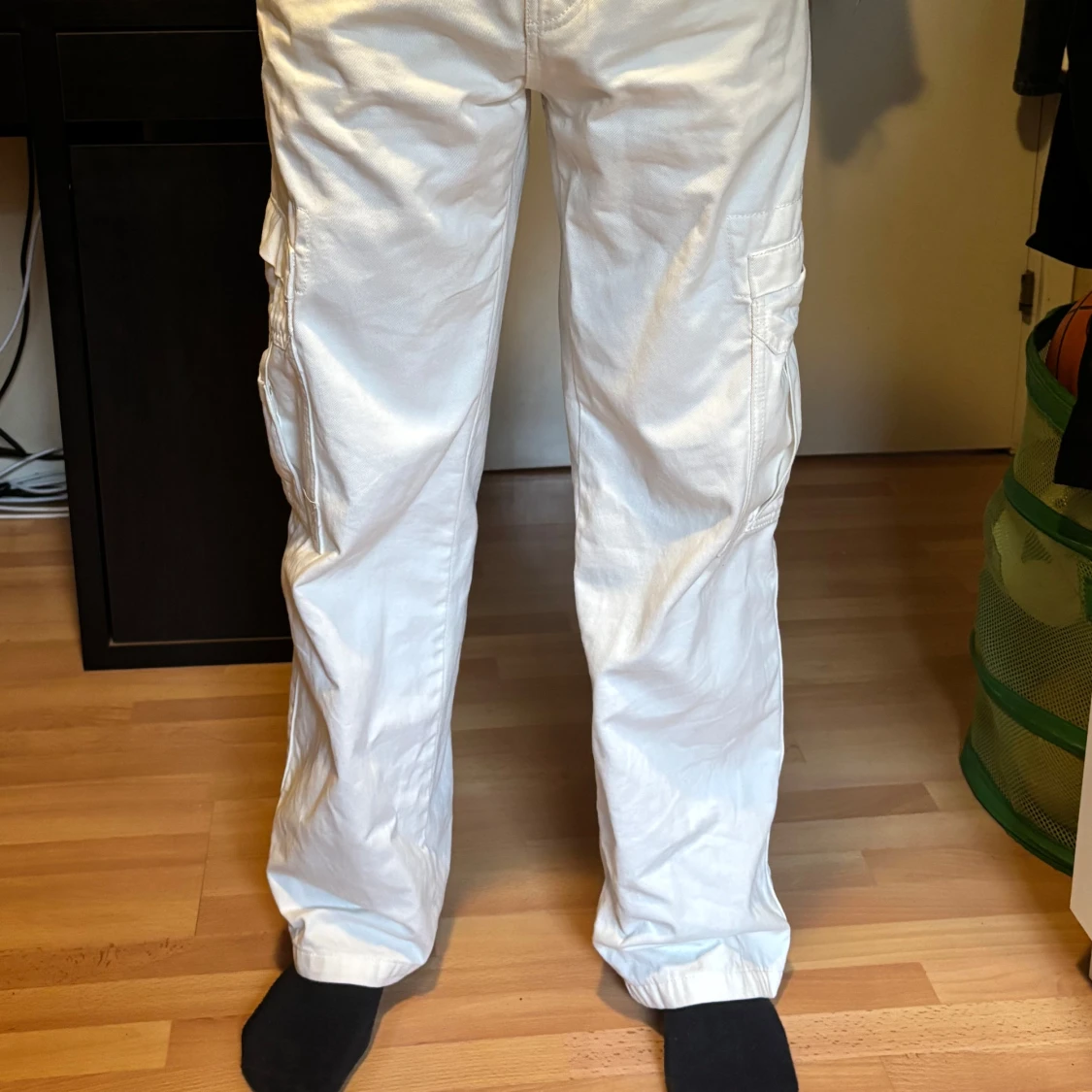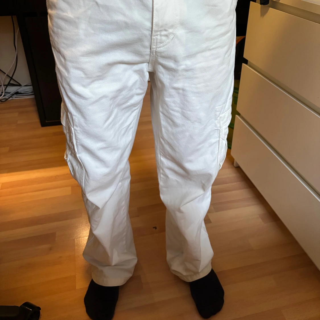 Säljer ett par vita cargopants med raka ben och flera praktiska fickor på sidorna. Byxorna har normal passform och är tillverkade i bomull, perfekta för en avslappnad stil. Klassisk midja och diskreta sömdetaljer.