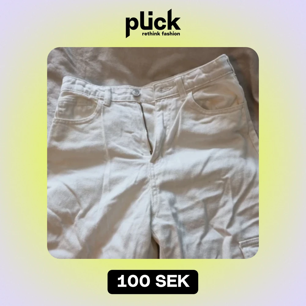 Nästan helt oanvända, dvs mycket bra skick. Tre fickor på benen, och "vanliga" fickor upptill (inga bakfickor). Raka/vida ben, med kort slits längst ner så de lägger sig bra vid skorna.