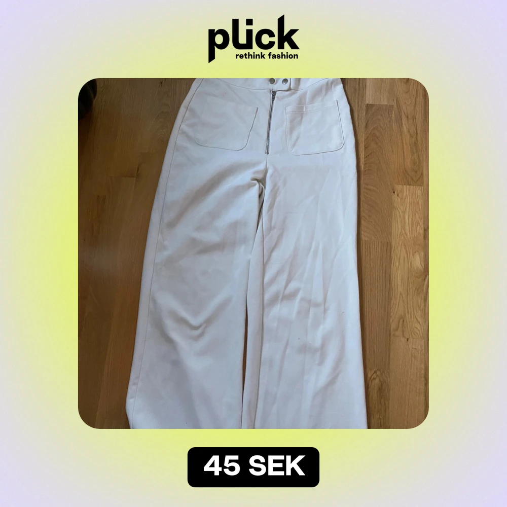 Säljer ett par vita byxor i mycket bra skick. De har en snygg dragkedja framtill och två knappar i midjan. Byxorna är i en loose passform och passar perfekt för både vardag och fest, få skavanker som man kan se på bilderna (liten fläck o en söm men inget som syns tydligt)