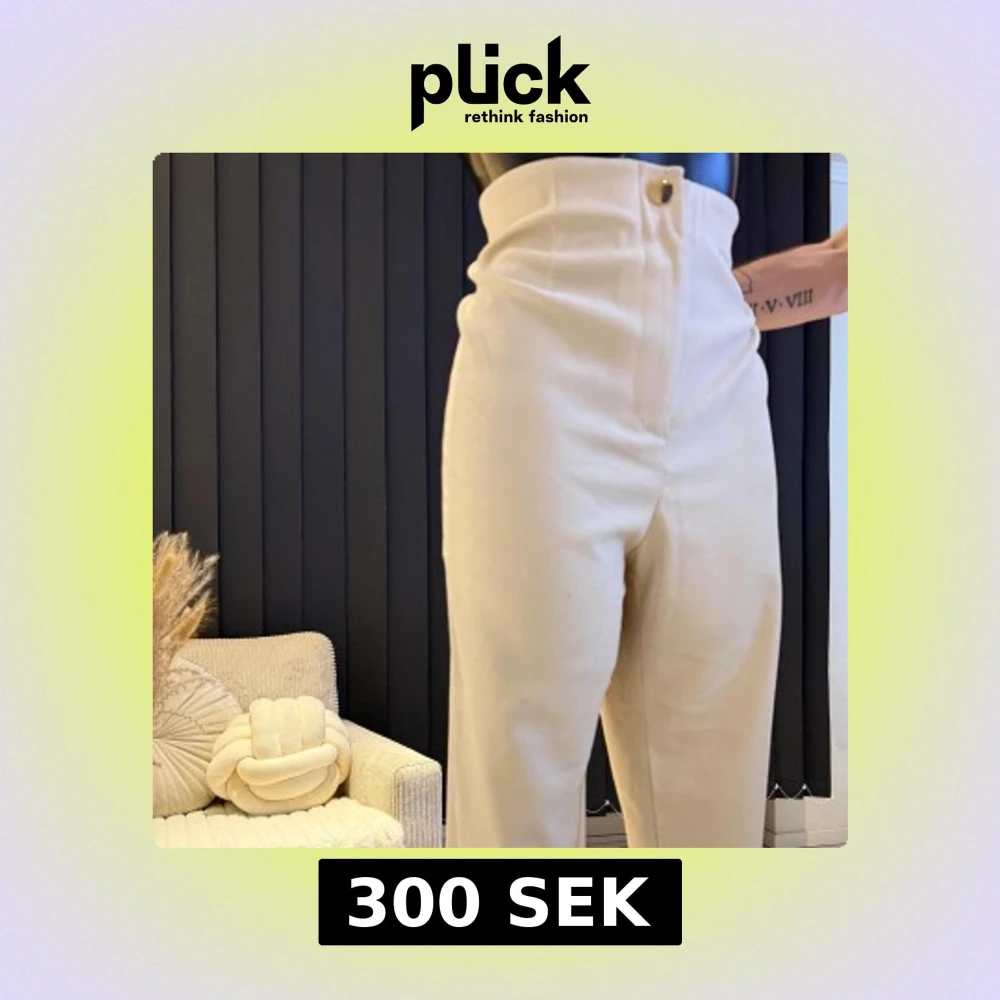 Snygga vita byxor med hög midja och knappdetalj. Perfekta för en stilren look. Byxorna har en rak passform och är tillverkade i ett mjukt material som ger en bekväm känsla. Jättefina och moderna byxor från Zara butik. Passar perfekt i M/L storlek.🌸👌