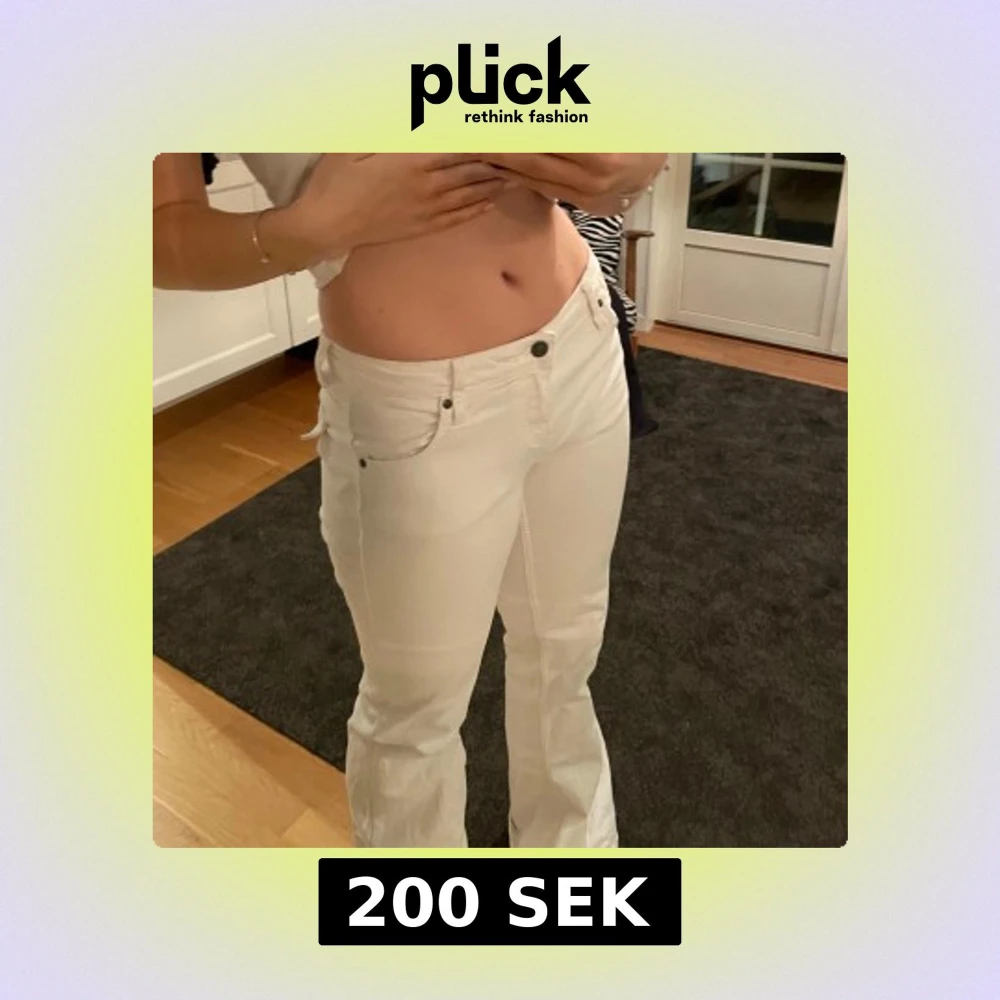 Snygga vita jeans från Bershka med låg midja och bootcut. Byxorna har knappar och dragkedja framtill samt fickor både fram och bak. Innerbenslängd 82cm, midja 37cm tvärs över. Säljer då dem ej använda tillräckligt 💕