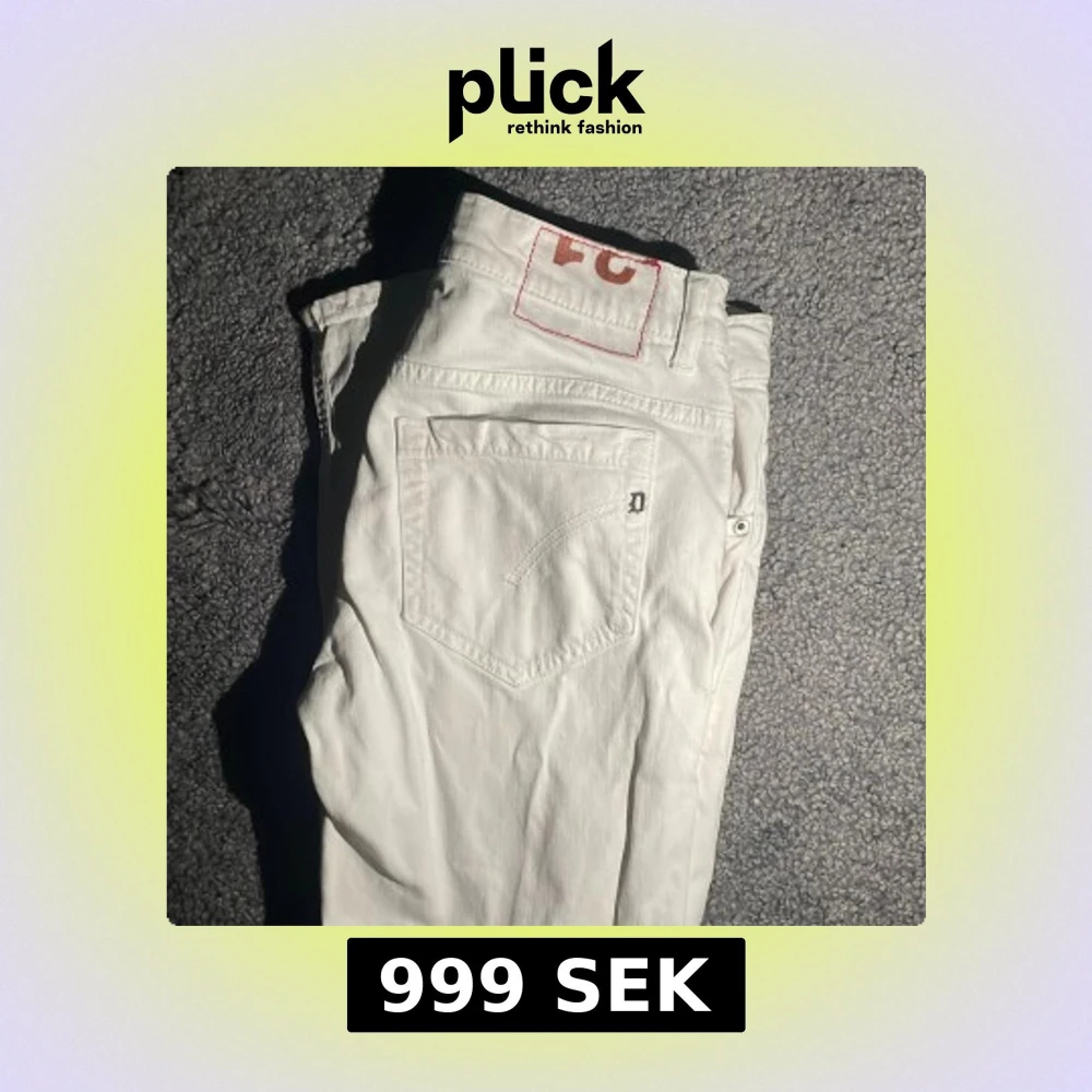 Säljer ett par vita jeans från Dondup med klassisk femficksdesign och raka ben. Byxorna har en snygg läderpatch bak i midjan och diskreta sömdetaljer. Perfekta för dig som vill ha en clean och fräsch look.