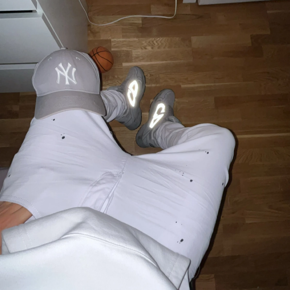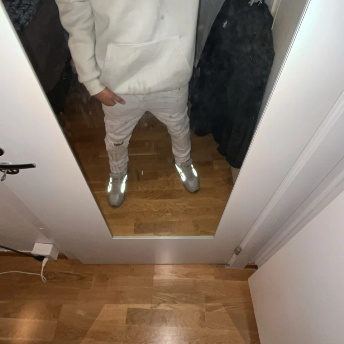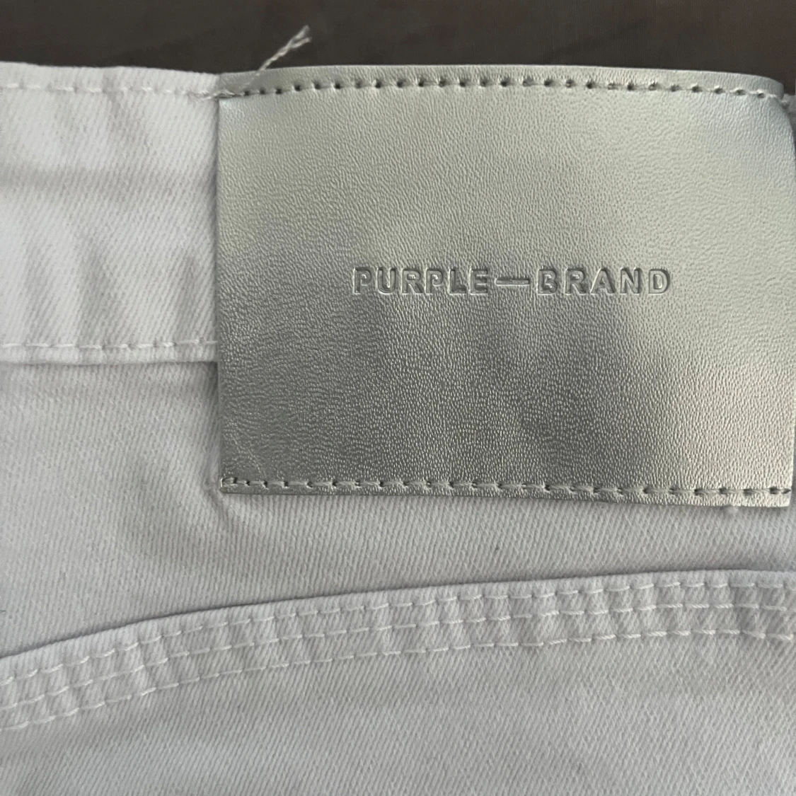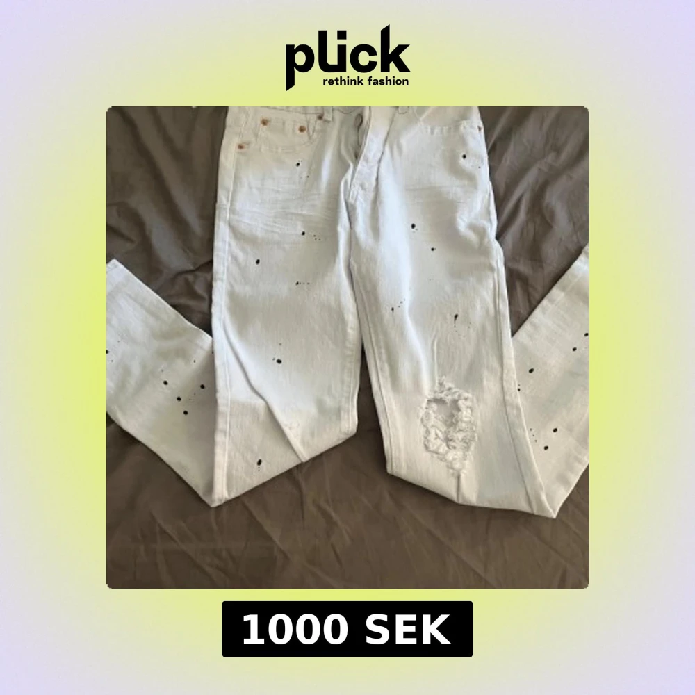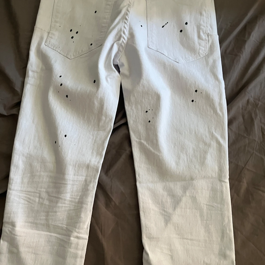 Säljer ett par vita jeans från Purple Brand med svart färgstänk och slitning vid knät. Klassisk femficksmodell i bomull med rak passform. Snygg detalj med silverfärgad patch i midjan. Perfekta för dig som gillar streetwear och unika detaljer.