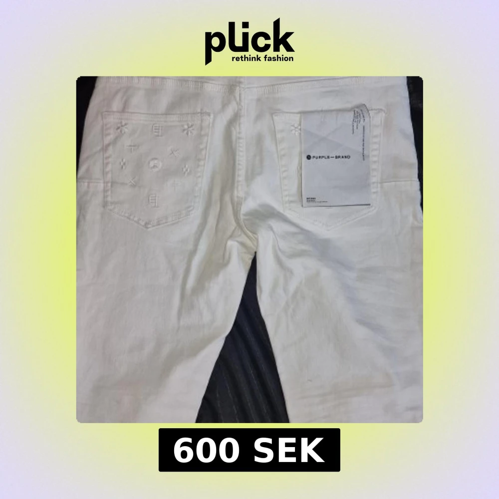 Säljer ett par fräscha vita jeans från Purple Brand i storlek 38. Byxorna har snygga broderade detaljer på bakfickorna och längs benen, klassisk femficksmodell och silverfärgade nitar. Perfekt för dig som vill sticka ut med stilrena detaljer.