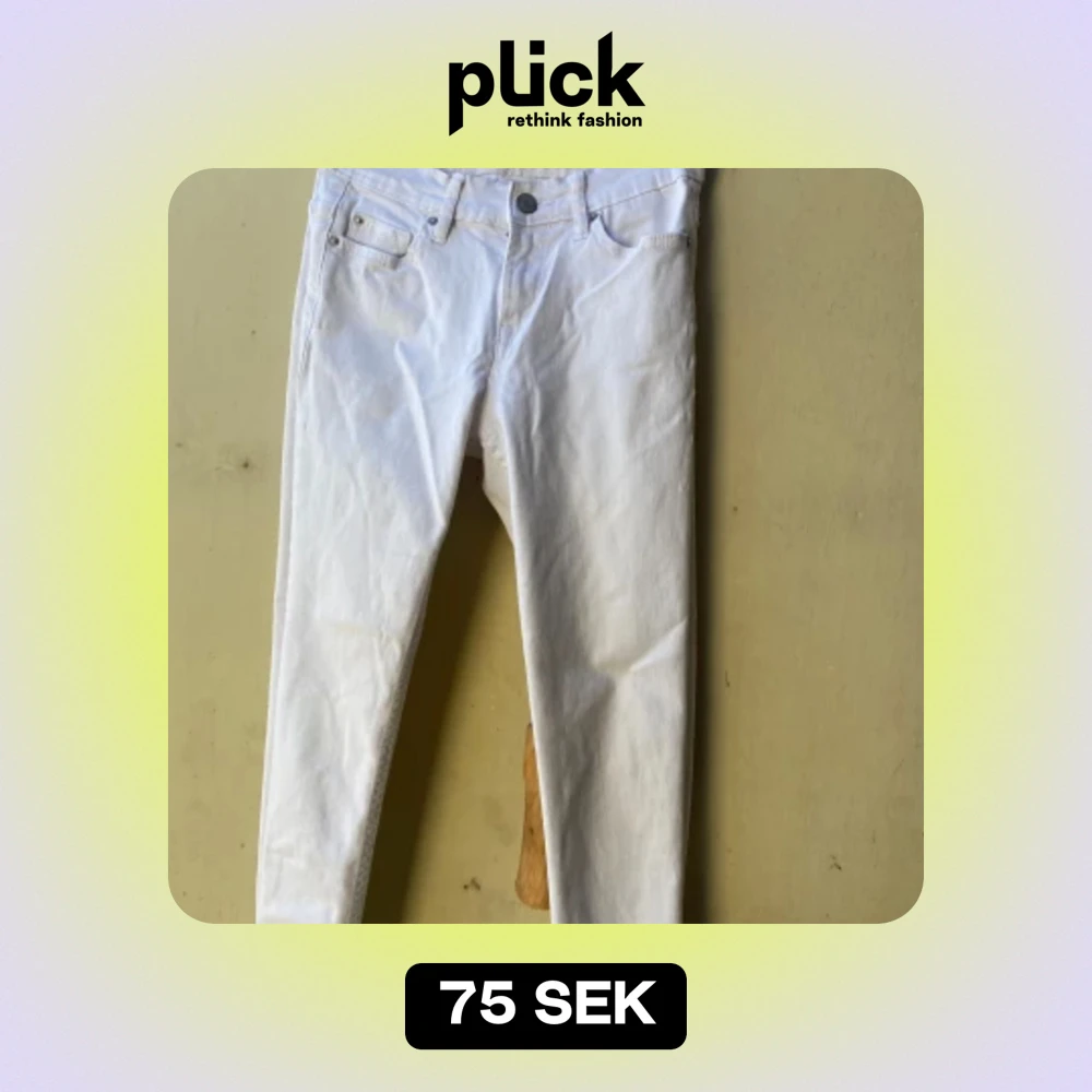 Säljer ett par vita jeans i storlek W26. De är i skinny fit och har en klassisk femficksdesign med knapp och dragkedja framtill. Perfekta för både vardag och fest!