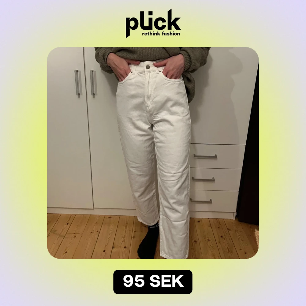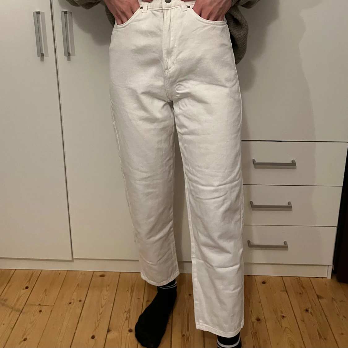 Säljer ett par vita jeansbyxor i mycket bra skick. De är högmidjade och har en straight passform som ger en stilren look. Perfekta för både vardag och fest! 🕺