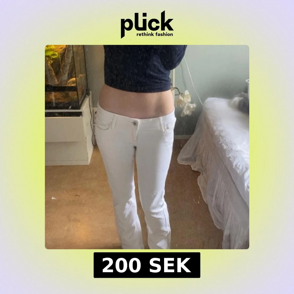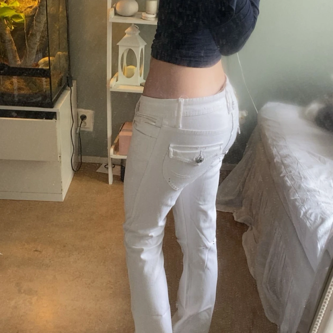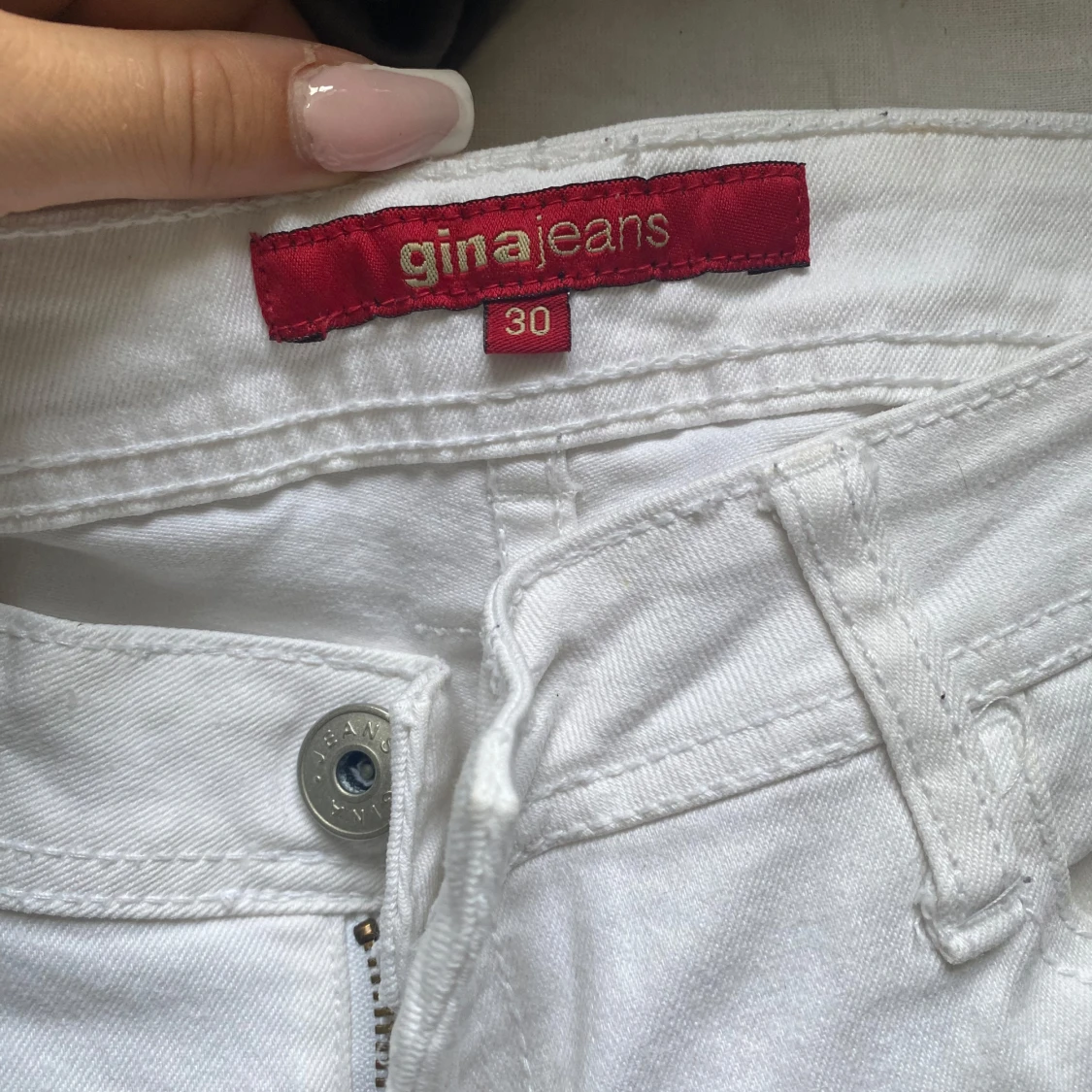 Säljer ett par vita jeansbyxor från Gina Tricot med låg midja och raka ben. Byxorna har klassiska fickor fram och bak, samt snygga detaljer på bakfickorna. Perfekta för dig som gillar en clean och fräsch look.