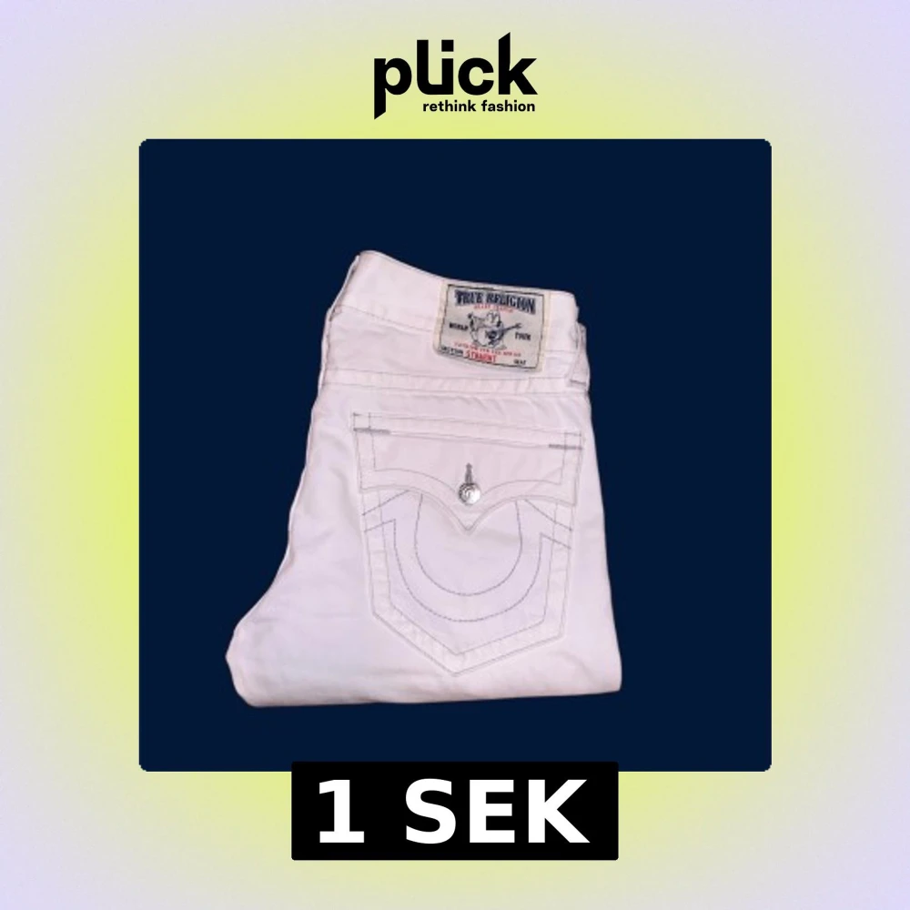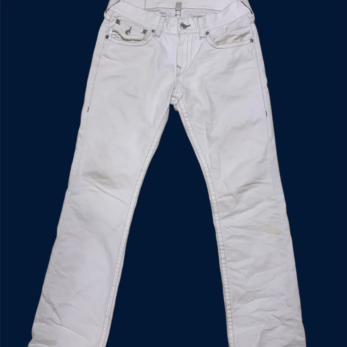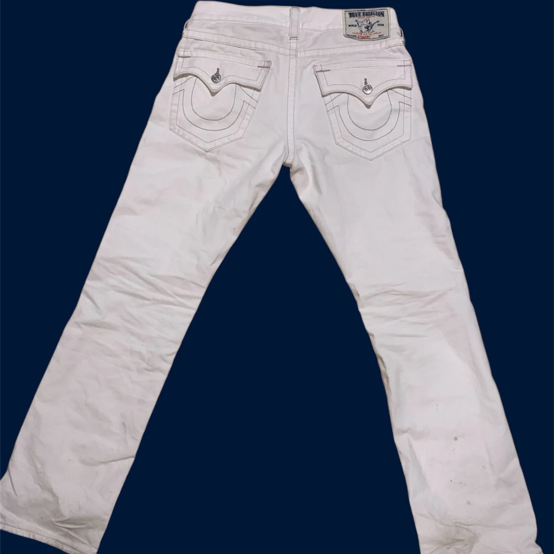 TAR ÄVEN BYTEN❗️Snygga vita jeansbyxor från True Religion med ikonisk broderad fickdesign. Byxorna har en klassisk femficksmodell och knappar i silverfärg. Perfekta för en stilren look.