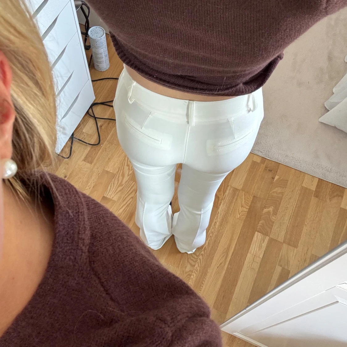 Snygga vita kostymbyxor med bootcut modell och låg midja. Byxorna har fickor fram och bak. Perfekta för en clean och stilren look. Ganska tunnt material. Långa byxor med en innerbenslängd på ca 90cm🤍 Liten i storleken så de passar en som har storlek XS🤍
