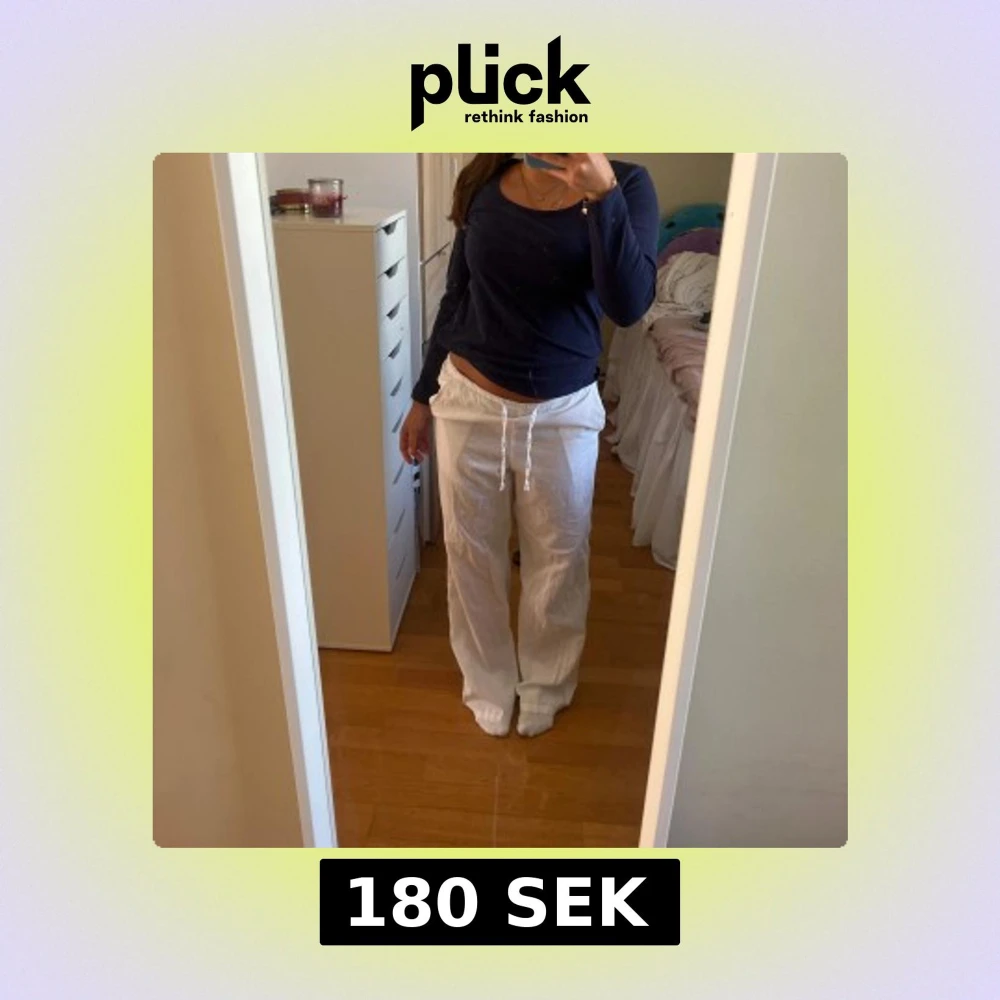 Säljer ett par vita linnebyxor med avslappnad passform. Byxorna är raka i modellen och är low waist. Är i stl 158/164 från Gina Tricot young men skulle säga att de sitter som en S. Säljer då de är lite för långa för mig som är 153cm💗💗