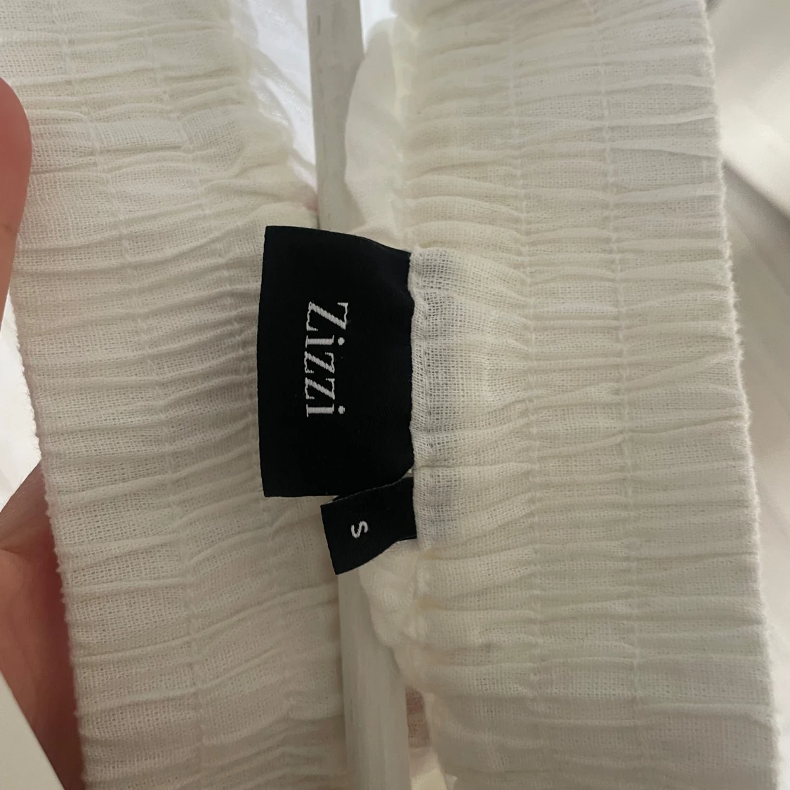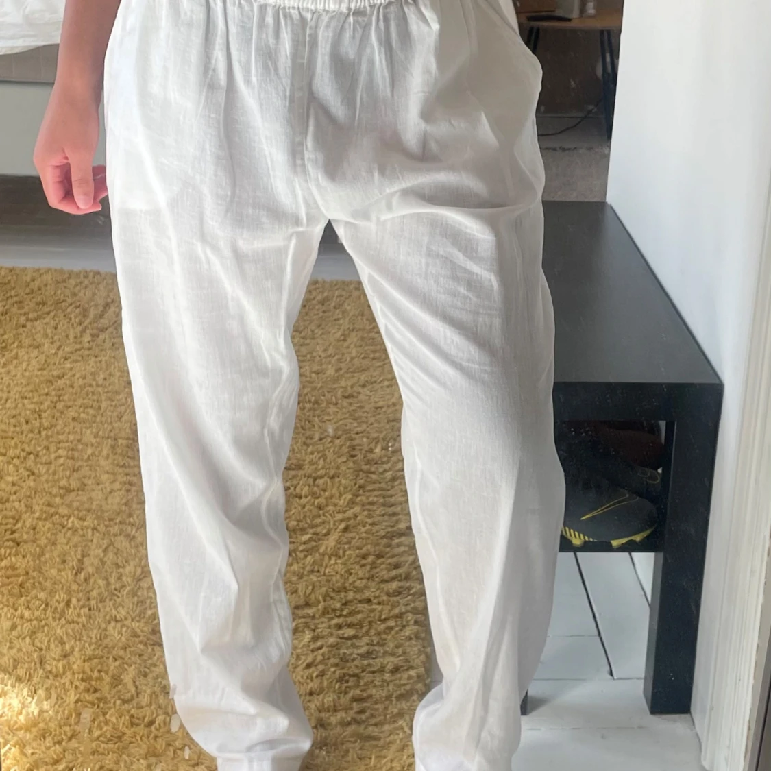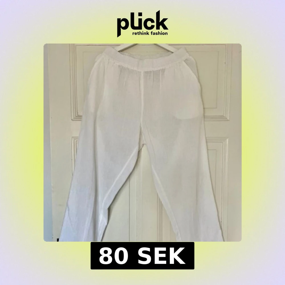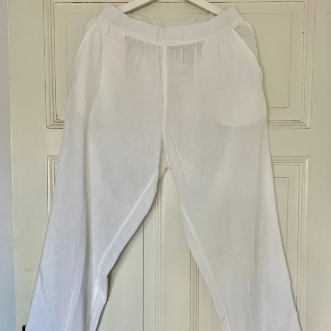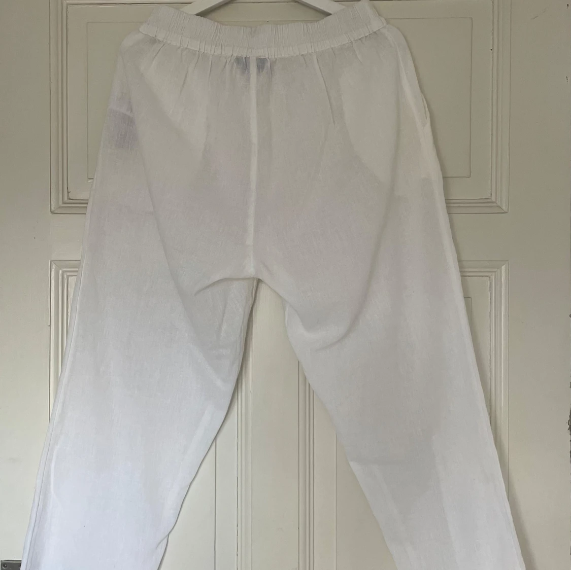 Säljer ett par vita linnebyxor. Byxorna har elastisk midja och raka ben🤍