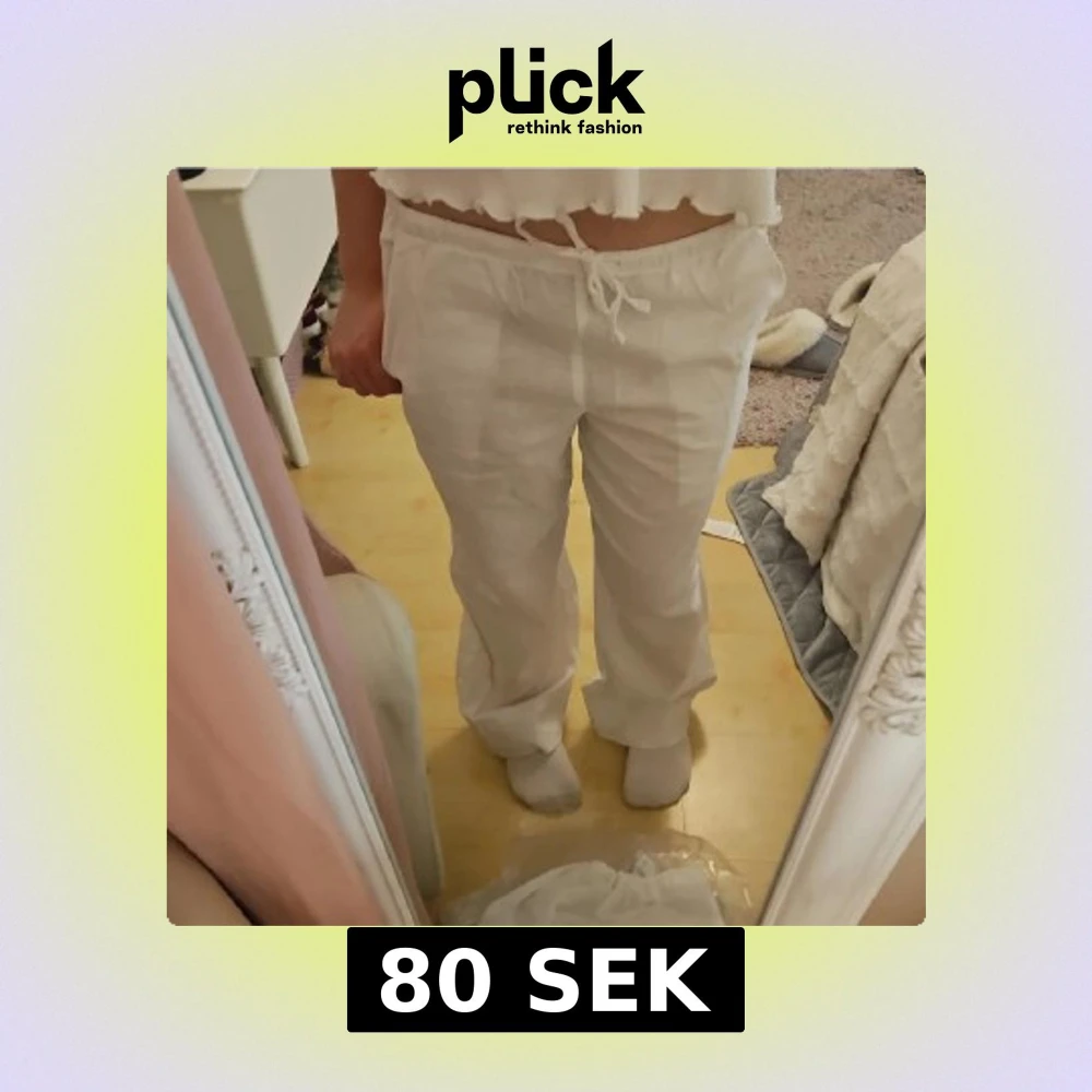 Snygga vita linnebyxor från Gina Tricot med låg/mellanhög midja och raka ben. Perfekta för sommardagar. Väldigt genomskinliga, sitter snyggt, endast använda få gånger och i bra skick. Tyvärr så är storlekslappen avklippen men original storlek är xs, men de är uppsydda längst ner så att de passar storlek 152! Perfekta för sommaren. Nypris runt 300 kr!