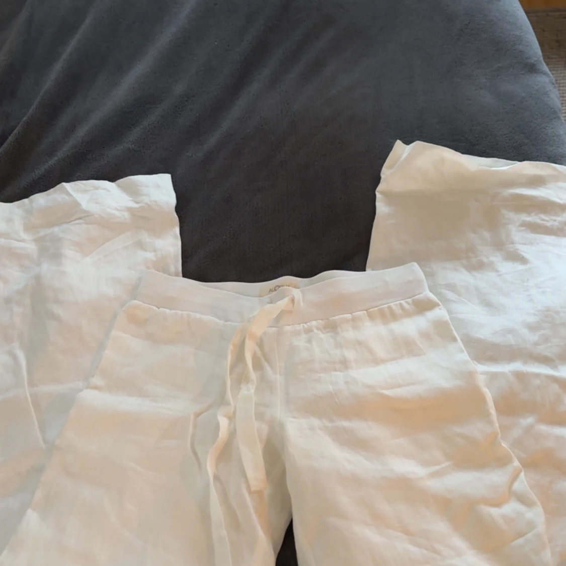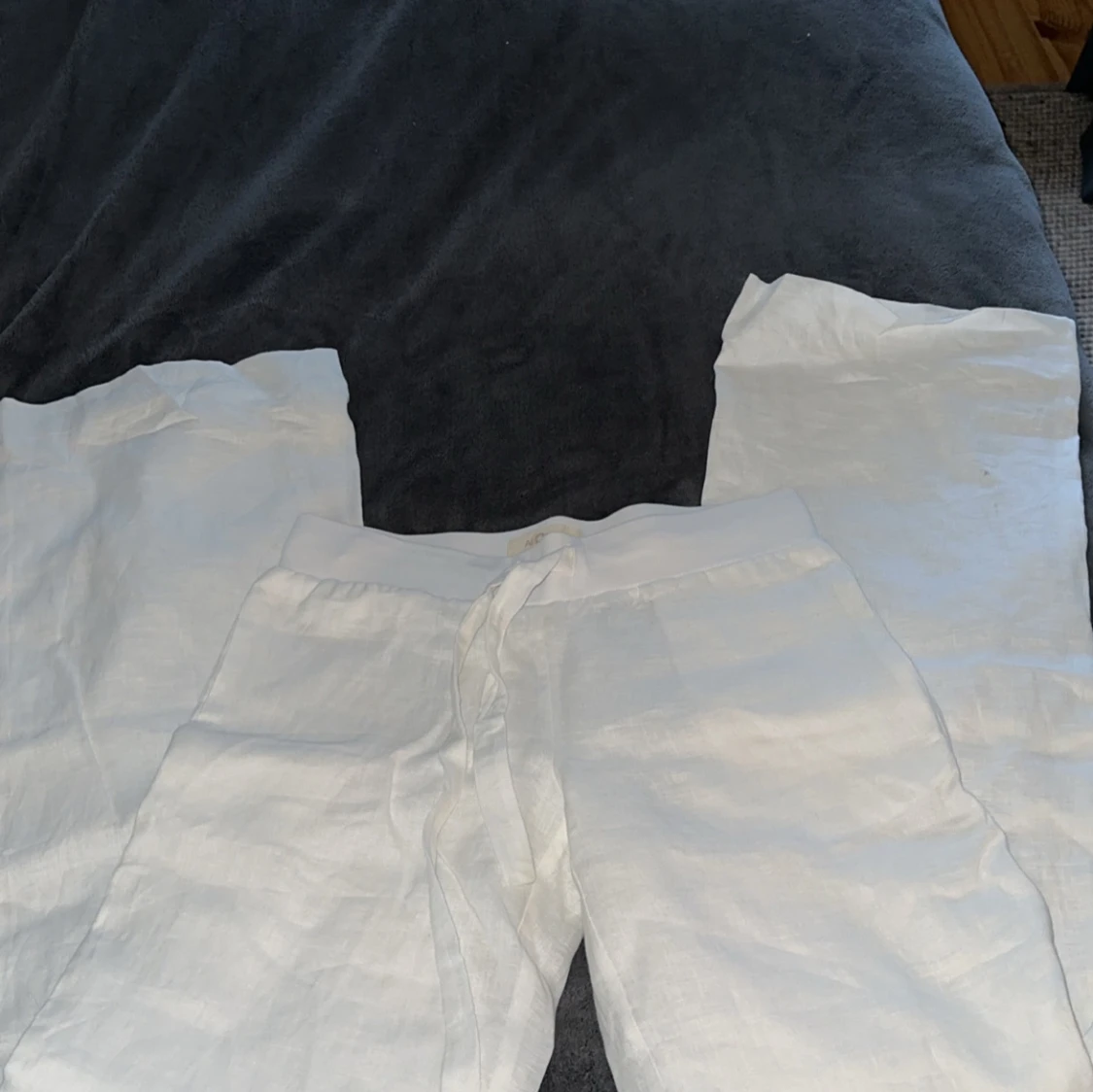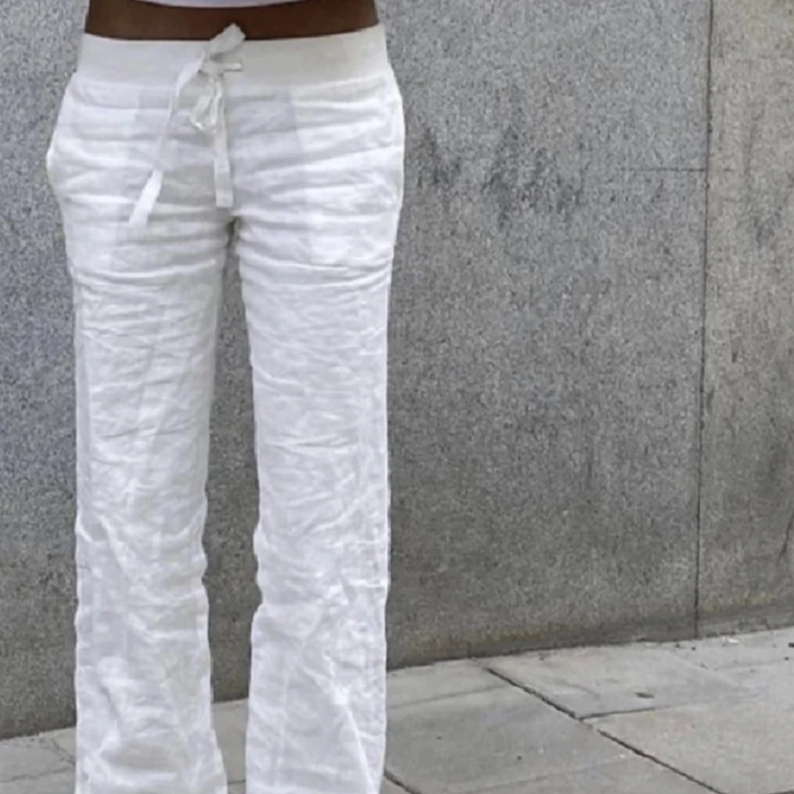 Snygga vita, lågmidjade linnebyxor med snörning i midjan. Helt nya och endast testade, därför i väldigt bra skick! Storlek XS. Nypris 800kr💕💕