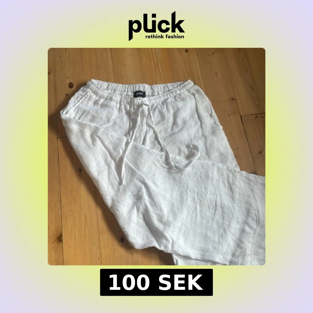 Säljer ett par fräscha vita linnebyxor från Define. Byxorna har resår i midjan och snörning för extra bekväm passform. Perfekta för varma dagar och chill vibes. Lätta och luftiga med raka ben och sidfickor. Använda fåtal gånger och i nytt skick utöver att dom är lite skrynkliga❤️
