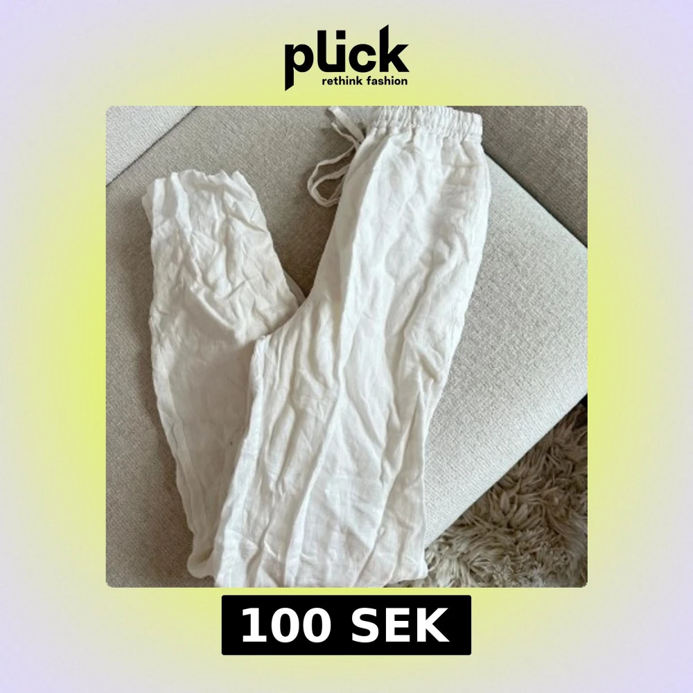 Säljer ett par vita linnebyxor från Design by Si i storlek S. Byxorna har resår och snörning i midjan för skön passform. Aldrig använda