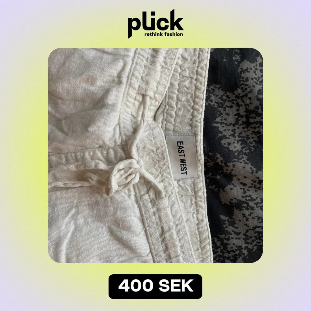 Säljer ett par vita linnebyxor från East West. De har en avslappnad passform med elastisk midja och snörning för extra komfort. Perfekta för varma sommardagar eller en avslappnad dag hemma. Byxorna har fickor fram och är i ett lätt och luftigt material.