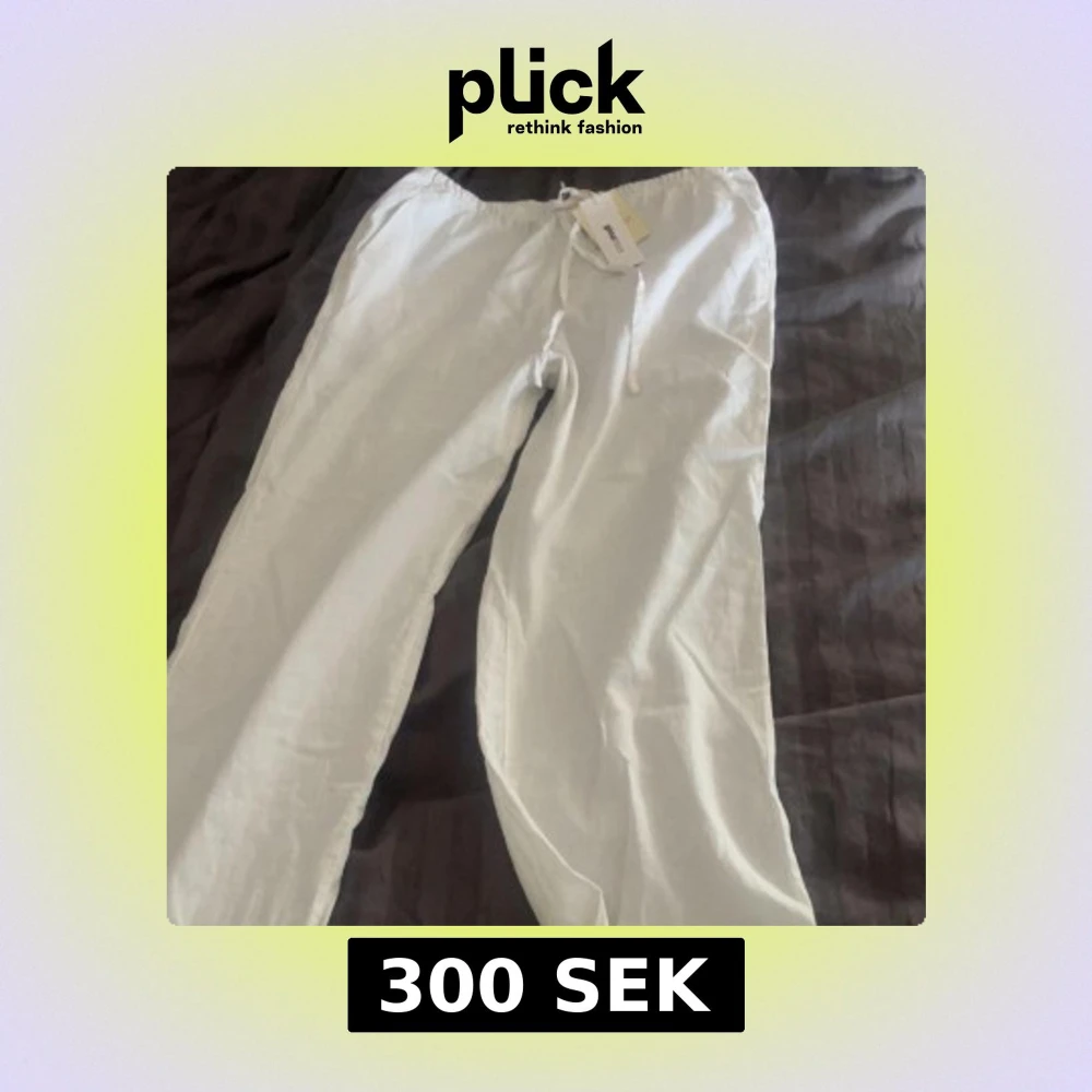 Säljer ett par fräscha vita linnebyxor från Ginatricot med dragsko i midjan. Byxorna har en avslappnad passform och är perfekta för varma dagar. Lätta och luftiga med klassisk look. Säljer då dem ej är använda alls. De har lappen kvar. Originalpris - 400