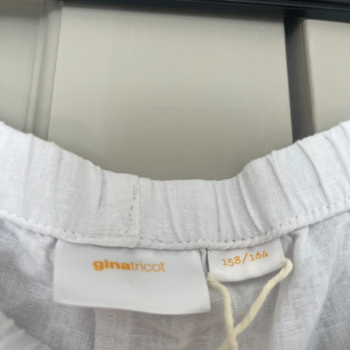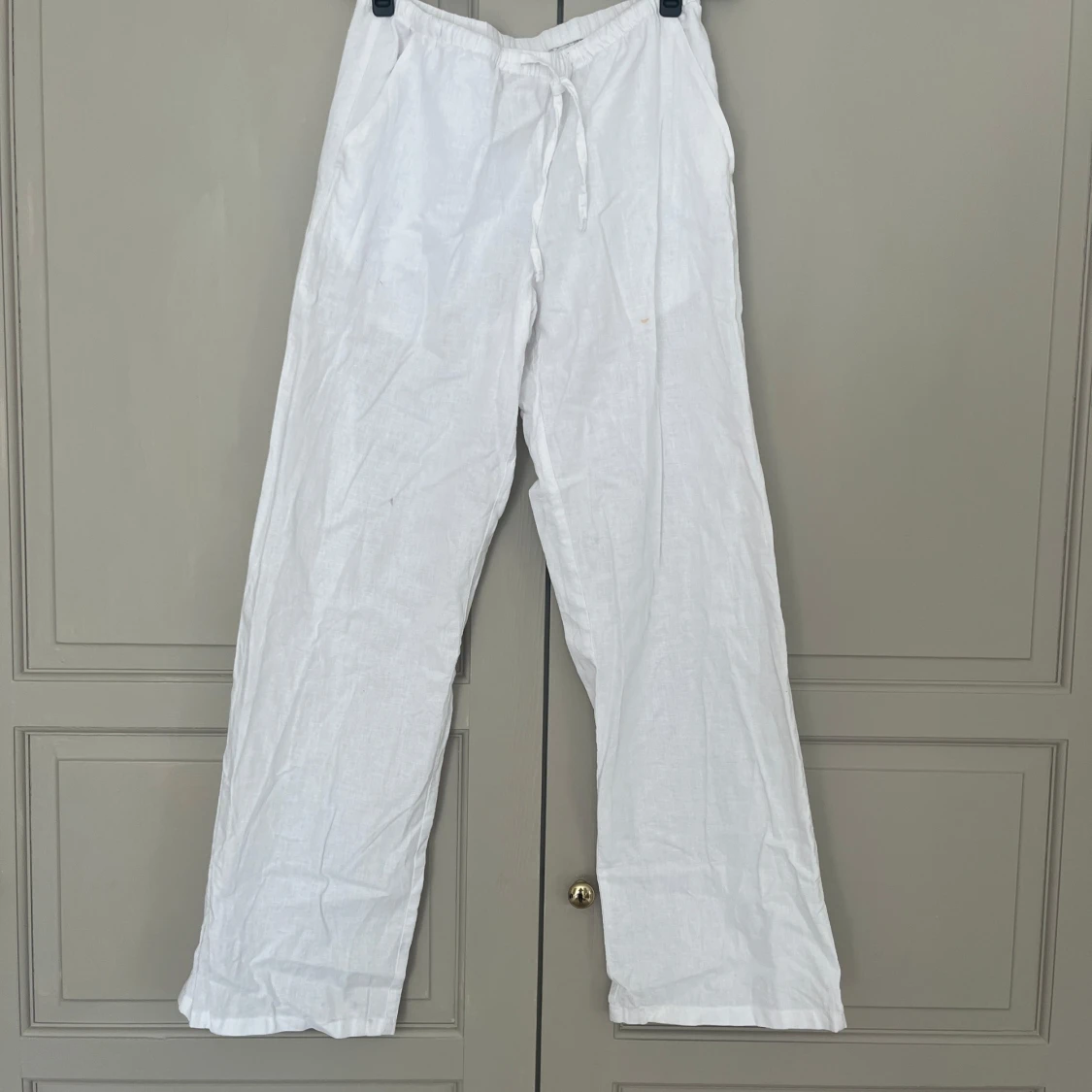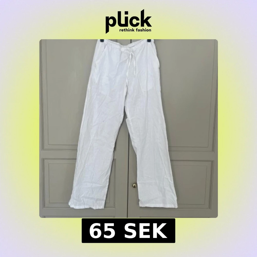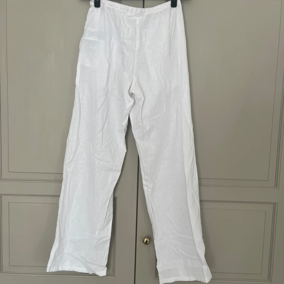 Snygga och luftiga vita linnebyxor från Gina Tricot med dragsko i midjan. Byxorna har raka ben och elastisk midja för extra komfort. Perfekta för varma dagar när du vill ha en chill och stilren look. Har en liten orange fläck