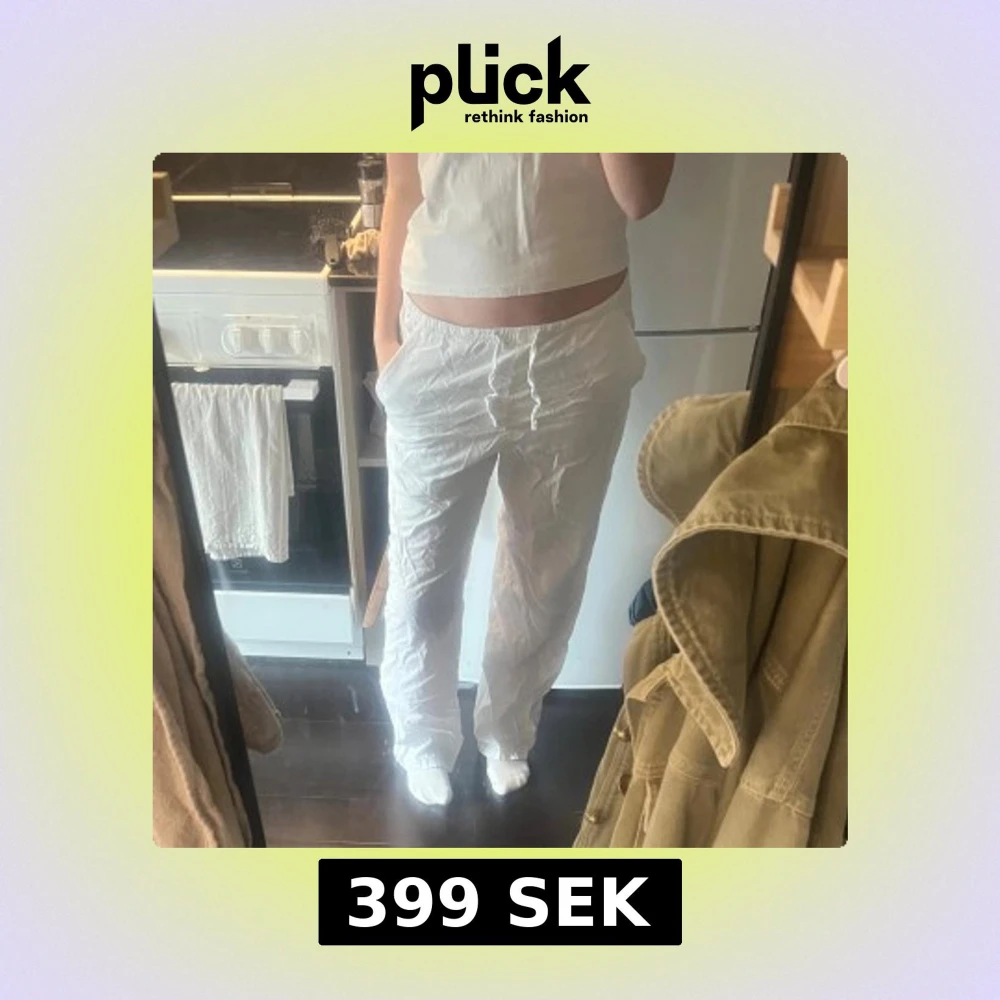 Säljer ett par vita linnebyxor från Gina Tricot med elastisk midja och raka ben. Byxorna har en avslappnad passform och är perfekta för varma dagar. De har fickor på sidorna och är tillverkade i ett lätt och luftigt linnematerial. Aldrig använda nypris 600. Orkade inte stryka