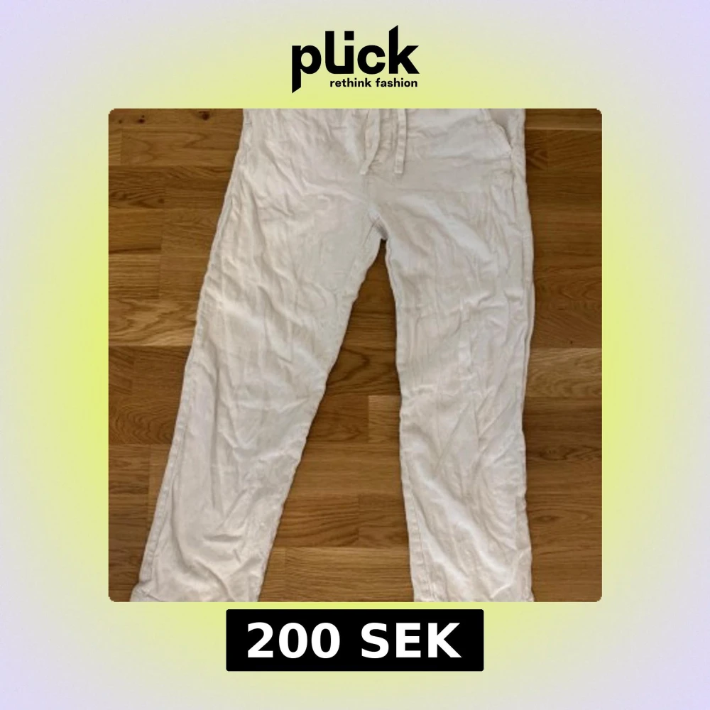 Säljer ett par vita linnebyxor från Only & Sons med avslappnad loose fit och dragsko i midjan. Byxorna har en skön och luftig känsla, perfekta för varma dagar.