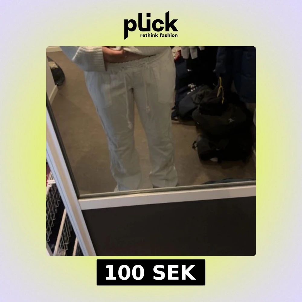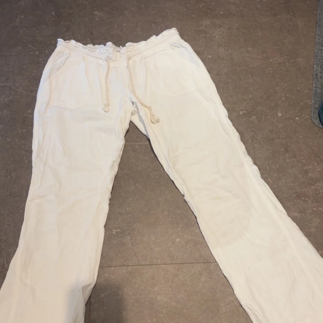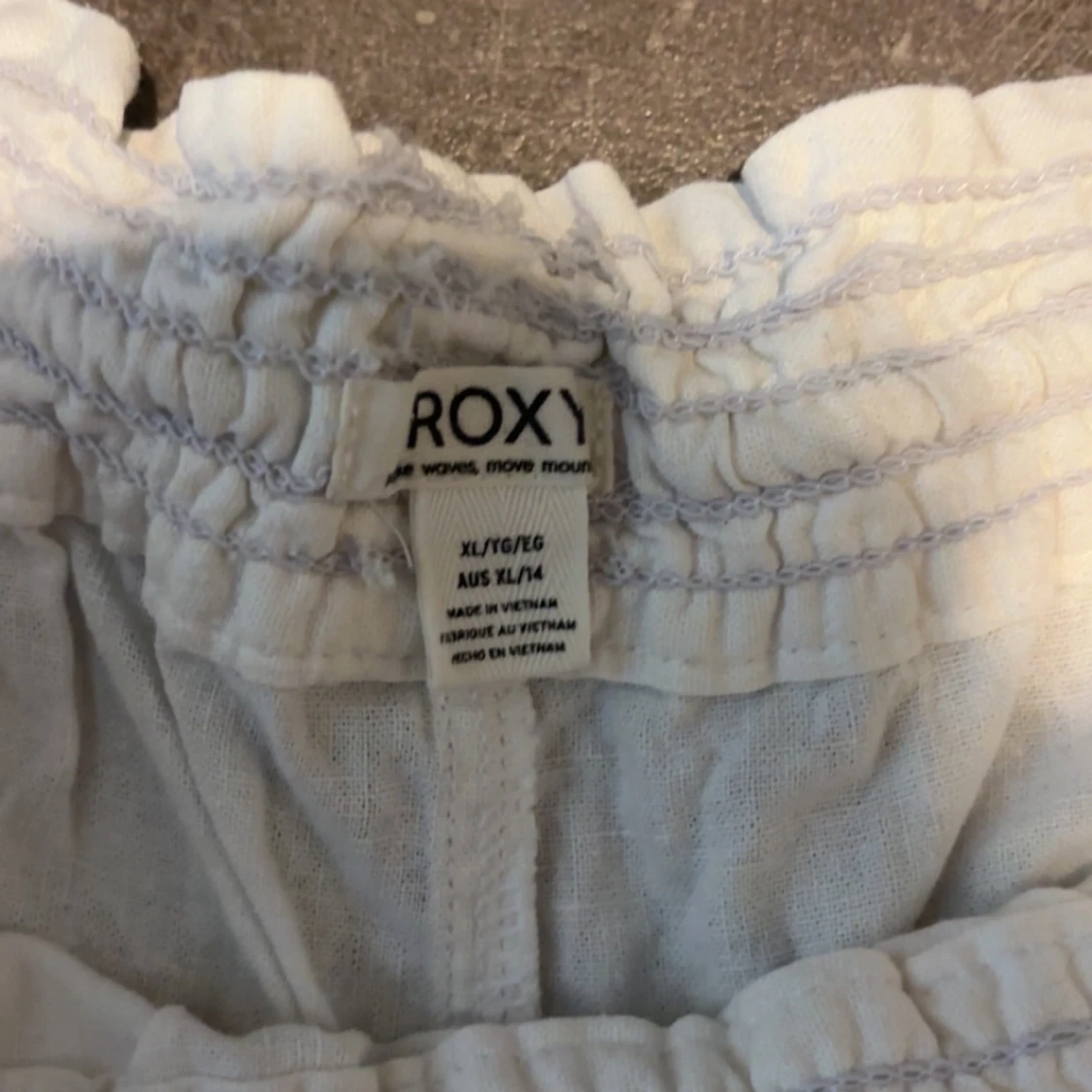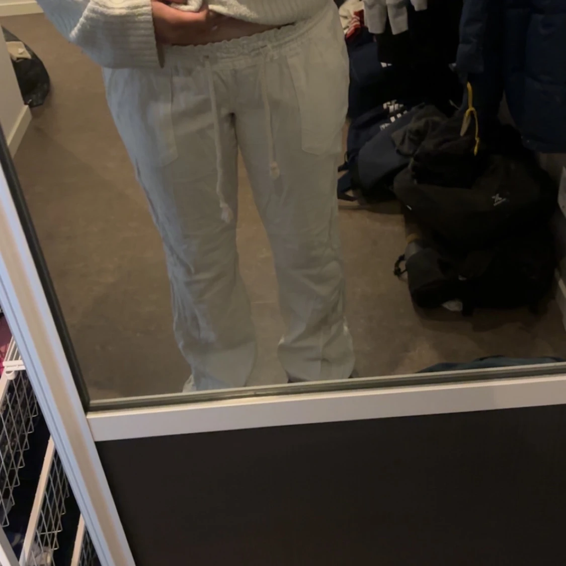 Säljer ett par vita linnebyxor från Roxy i storlek XL. Byxorna har rak passform, resår och snörning i midjan samt två fickor framtill. Säljer eftersom dom är förstora, endast testade